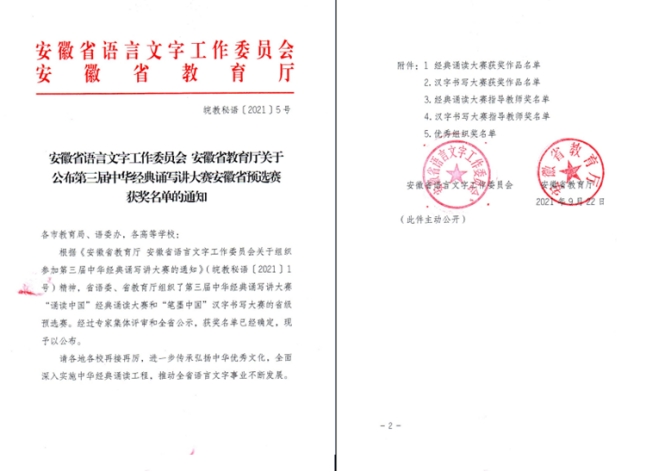 近日,安徽省语言文字工作委员会和安徽省教育厅公布了第三届中华经典诵写讲大赛经典诵读大赛安徽省预选赛的结果,best365官网共有6组作品获奖,其中《稻子熟了》(程正文、黄琳琳)、《可爱的中国》(曹勇、樊露露)、《望星空》(魏雅男、范家杰)三组作品荣获二等奖,《与妻书》(曹勇、程晨)、《等待》(唐雪玲、杜玲)两组作品获得三等奖,作品《贺华诞百年,敬我党荣光》(胡梦迪、徐海涛、朱源、李蒙蒙、应温琪、杨勇、陈凡)获得优秀奖。指导教师汪胜水、陈春雷获经典诵读大赛指导教师奖。best365手机版官方网站、best365手机版官方网站文学与传媒学院均获组织奖。