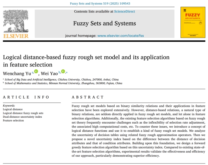 近日,best365官网大数据与人工智能学院青年教师俞文昌在模糊数学国际权威期刊《Fuzzy Sets and Systems》(中科院一区TOP期刊)上发表题为“Logical distance-based fuzzy rough set model and its application in feature selection”学术论文。