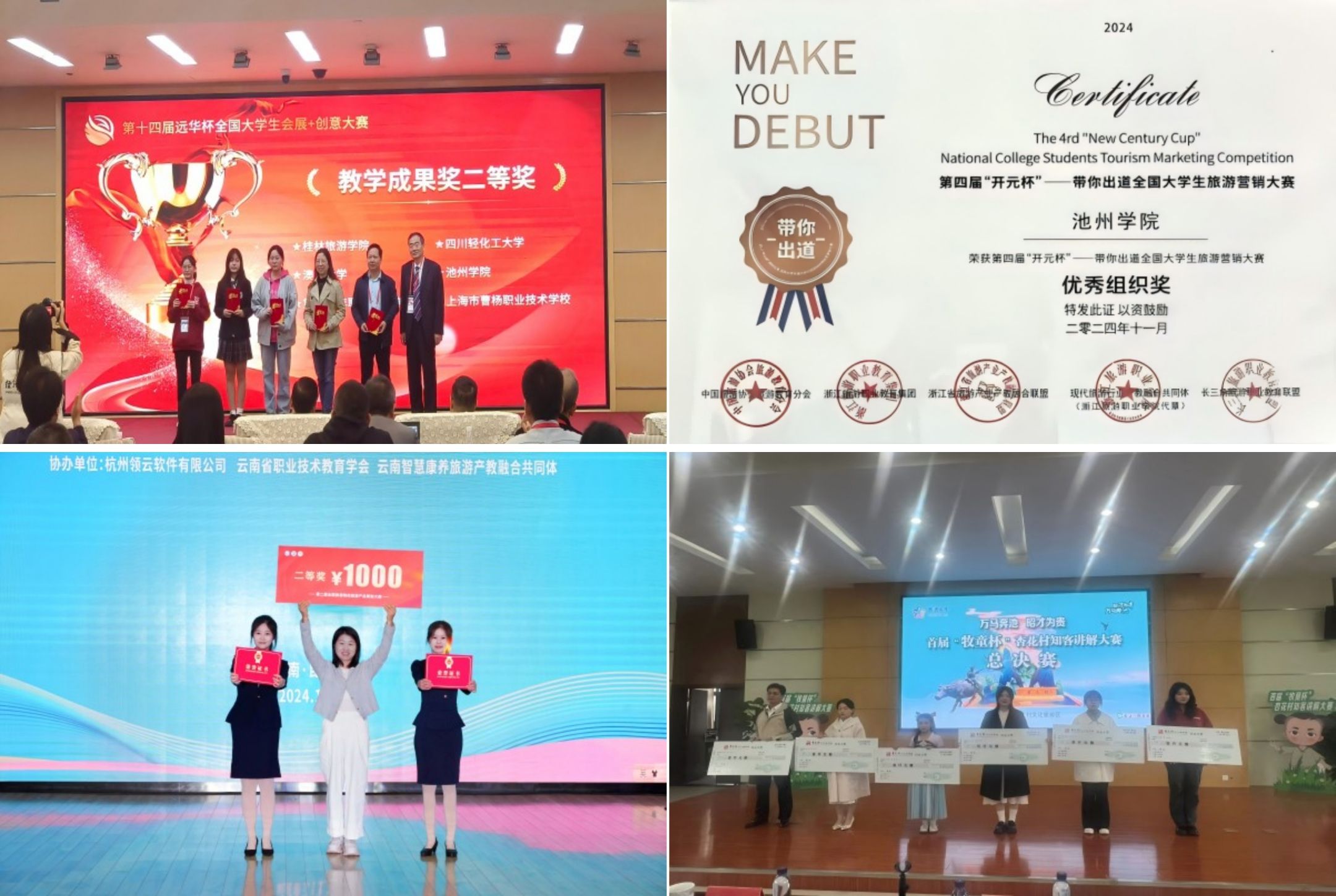 11月12日—14日,在“远华杯”全国大学生会展+创意大赛决赛中,23级文化产业管理2班曹颖、宋奕洁、杨淑敏、张邵寒学生组成的“努力就队”(指导教师:吴琼、石松平)荣获全国二等奖,best365手机版官方网站获得教学成果奖二等奖。11月14日—16日,在第二届全国旅游院校旅游产品策划大赛决赛中,23级旅游管理1班汪圆缘、丁慧中、张晓凡、涂欣语学生(指导教师:黄沛)荣获全国二等奖,另有8个团队获得优秀奖,best365手机版官方网站获大赛优秀组织院校奖。11月17日,在池州市杏花村文化旅游区管理委员会及贵池区文化和旅游局主办的首届“牧童杯”杏花村知客讲解大赛总决赛中,23级旅游管理1班左芮斩获一等奖。