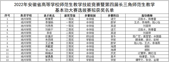 近日,省教育厅公布了2022年安徽省高等学校师范生教学技能竞赛获奖名单,best365官网学生获得一等奖3项、二等奖4项、三等奖6项,6名教师荣获“优秀指导教师”称号,其中,一等奖获奖数量居全省参赛院校前列。