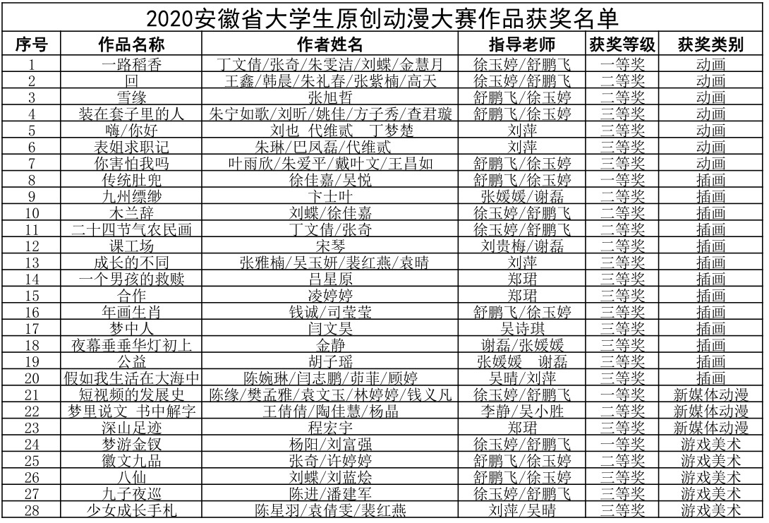 12月23日,2020安徽省大学生原创动漫大赛评选工作在安徽工程大学圆满结束,best365官网报送的参赛作品共有42件,其中获一等奖4项、二等奖8项、三等奖16项。