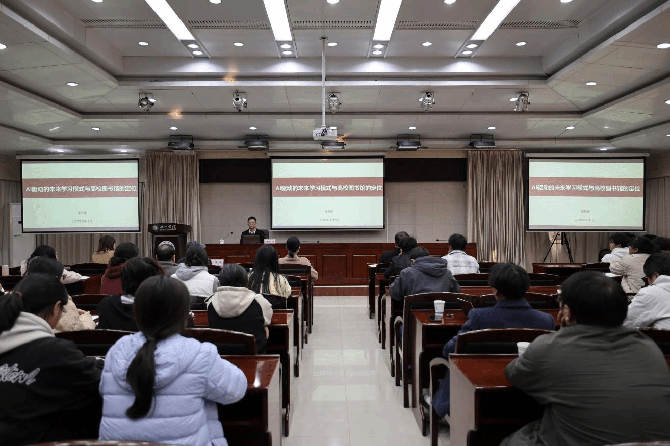 12月1日,中国图书馆学会理事、安徽省图书馆学会副理事长、安徽省高等学校图书情报工作委员会秘书长、安徽大学原图书馆馆长储节旺教授应邀来馆做了题为“AI驱动的未来学习模式与高校图书馆的定位”的学术报告。报告会由图书馆馆长叶三梅教授主持。
