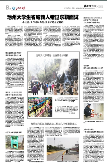 2月27日,池州日报在B2版头条以《池州大学生省城救人错过求职面试》为题报道了夏松事迹。