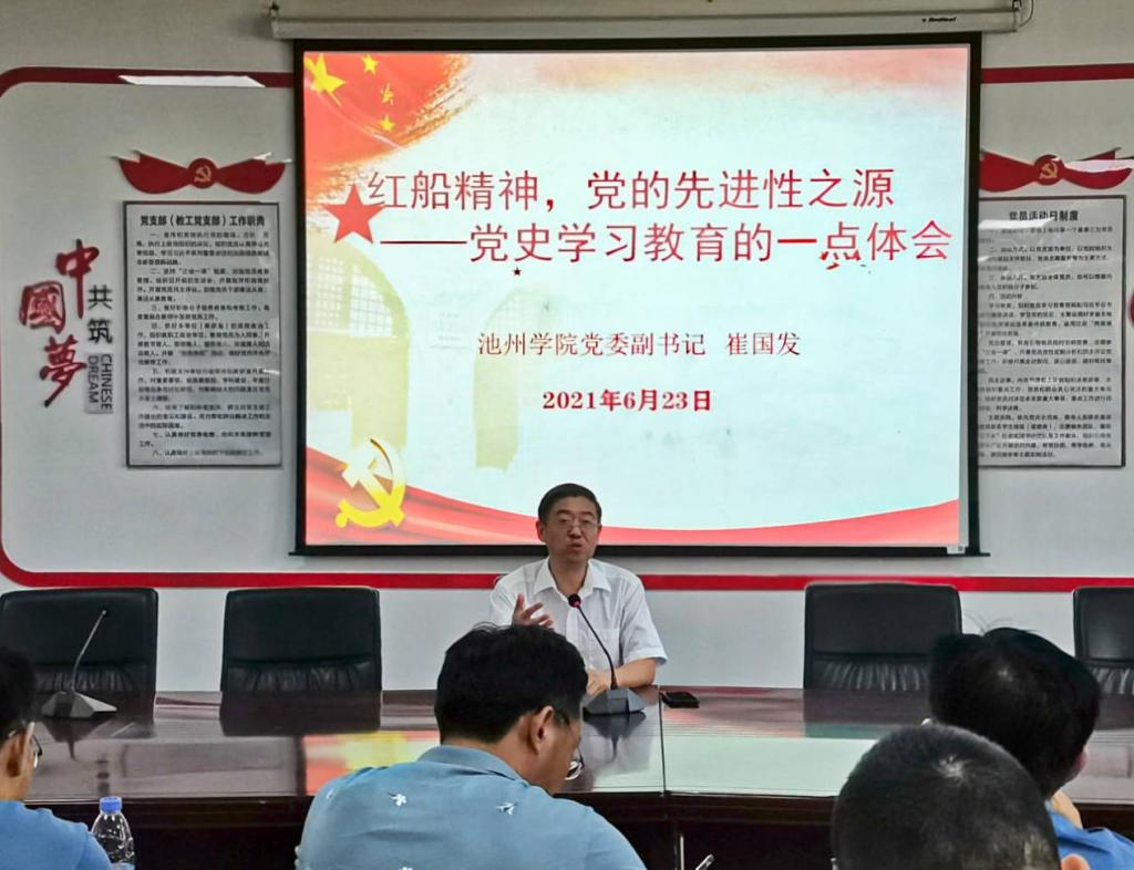 为深入推进党史学习教育,牢记初心使命、筑牢信仰之基,提升精神境界,6月23日下午,校党委副书记崔国发以《红船精神,党的先进性之源》为题为文学与传媒学院全体教职工上了一堂生动精彩的党课。
