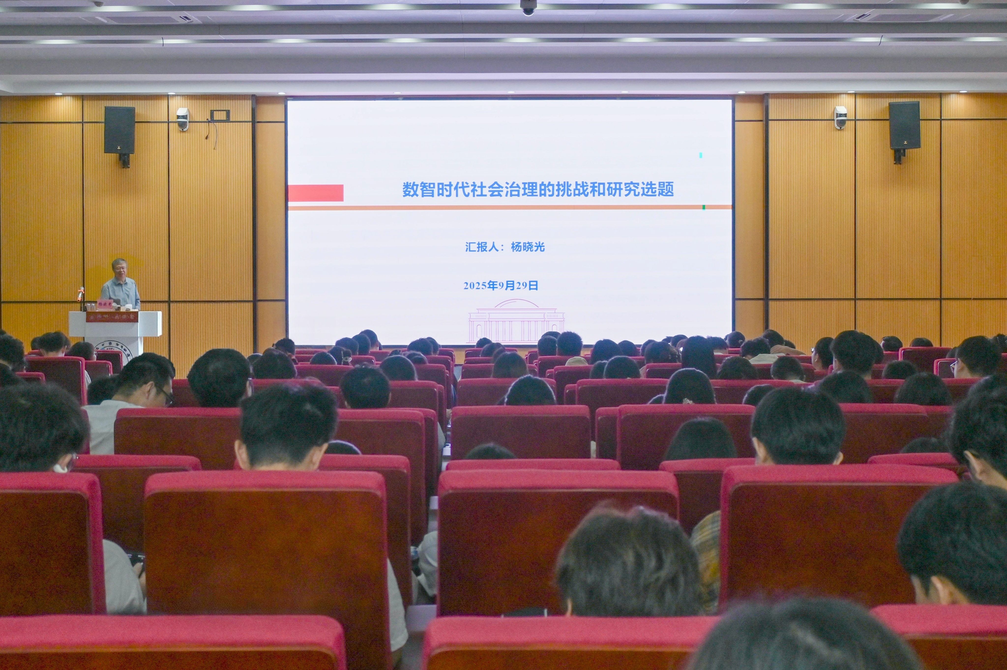 主旨报告环节杨晓光教授以“数智时代社会治理的挑战和研究选题”为题作首场报告。他以整体性的框架清晰地勾勒出数智时代的社会图景,系统阐述了数智技术对生产方式、商业模式和社会治理带来的根本性变革,深入剖析了技术异化、数据垄断等社会治理新挑战,提出了构建以人为本的新型社会治理模式的研究方向。