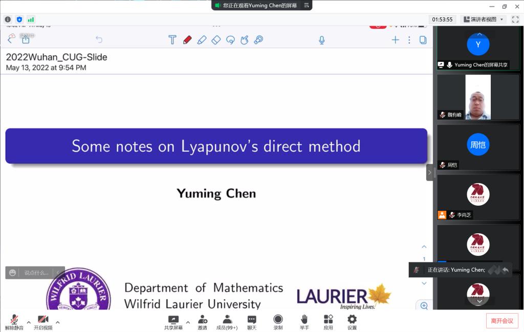 5月14-15日,“微分方程国际会议”通过腾讯会议线上举行,此次研讨会是中国地质大学(武汉)70周年校庆的系列学术活动之一,以更好地交流微分方程理论及相关领域的最新研究成果和学术发展动态为主旨,为国内外同行专家之间的学术交流与合作提供平台。开幕式由中国地质大学(武汉)数学与物理学院院长郭上江教授主持,大数据与人工智能学院周恺、赵舵舵两位教师应邀参会。