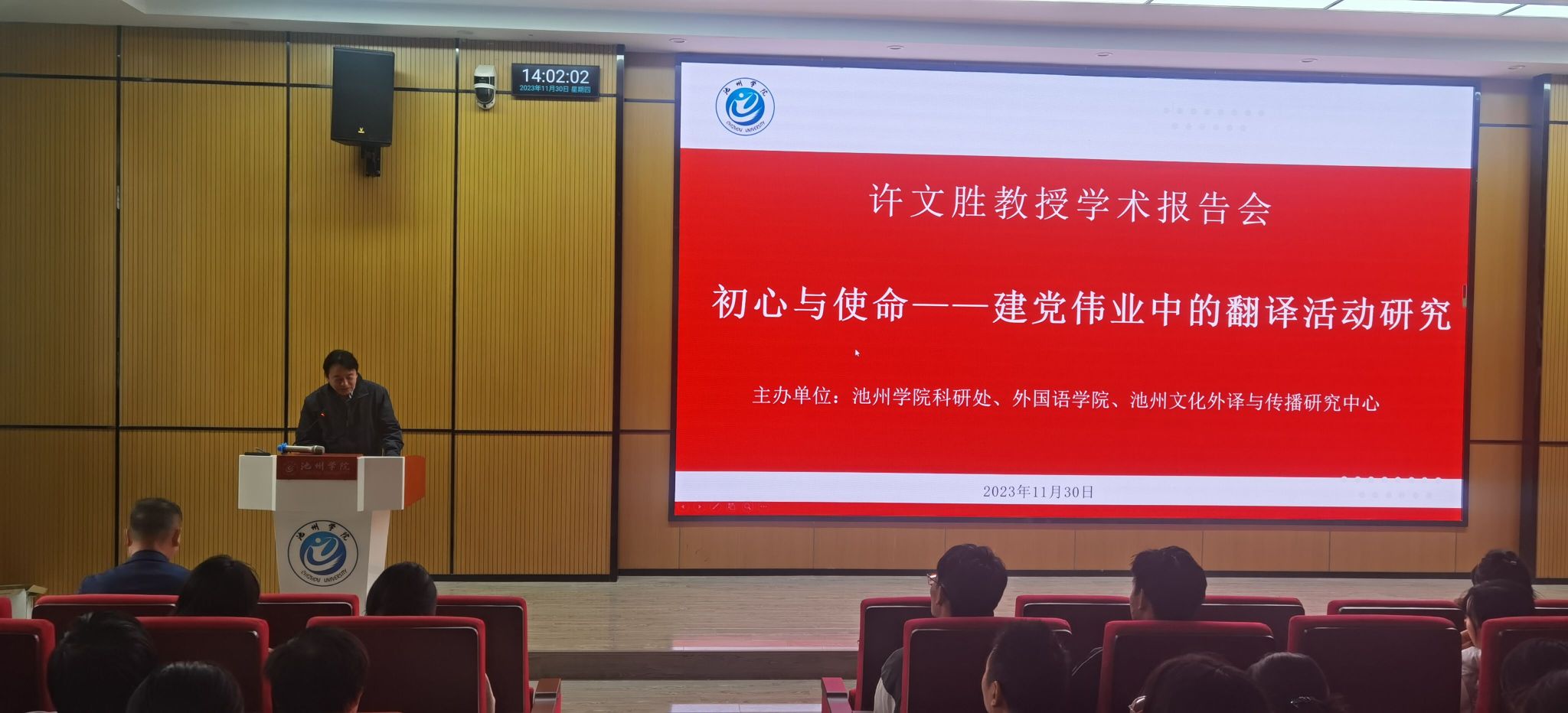 11月30日,外国语学院特邀同济大学教授、博士生导师许文胜来校举办题为《初心与使命——建党伟业中的翻译活动研究》的学术报告。市外办、学院教师和学生代表300余人参加。报告会由外国语学院院长余义兵主持。