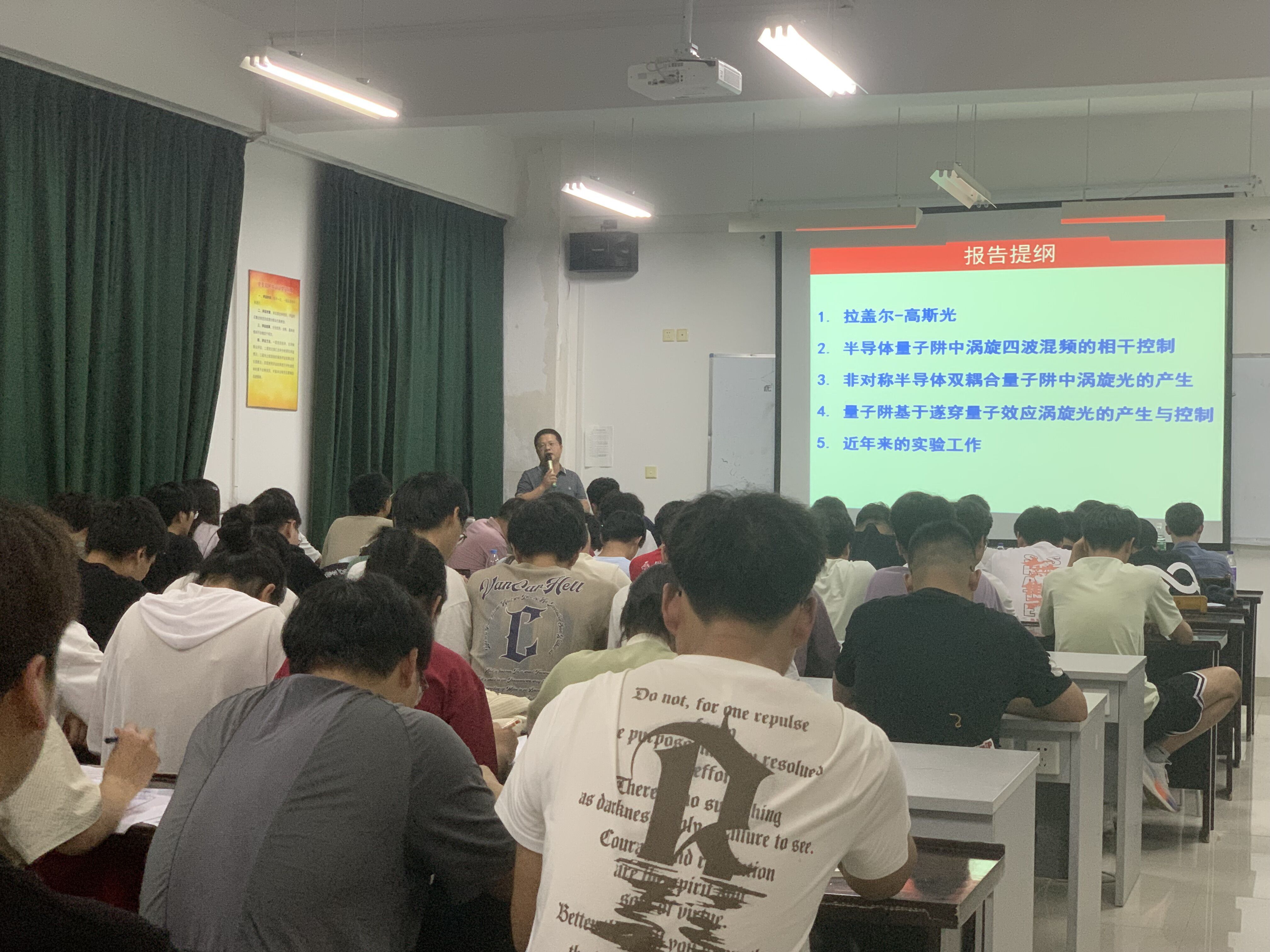 王志平从两个方面报告了不同半导体量子阱中涡旋光产生与调控等方面的研究工作。一方面,报告了如何利用轨道角动量光半导体量子阱中产生高效涡旋四波混频效应的新途径;另一方面,基于非线性四波混频过程讲授了半导体量子阱系统中高保真度轨道角动量光的实验产生与操控。