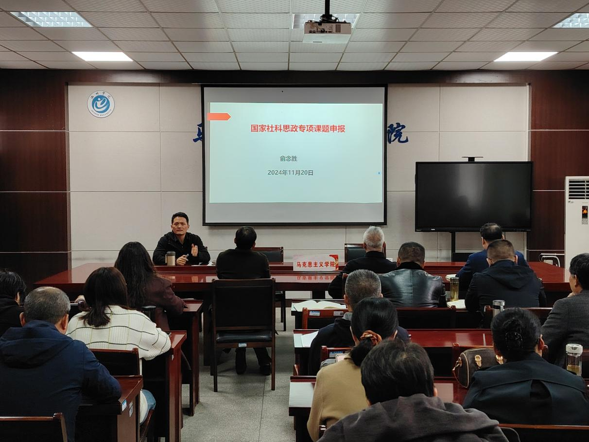 11月20日,马克思主义学院开展国家社科基金高校思想政治理论课研究专项(以下简称国社科思政专项)项目申报指导交流活动。马克思主义学院党委书记俞念胜作了关于国社科思政专项申报的专题讲座。副院长鲍红信主持讲座,全院思政课教师参加活动。