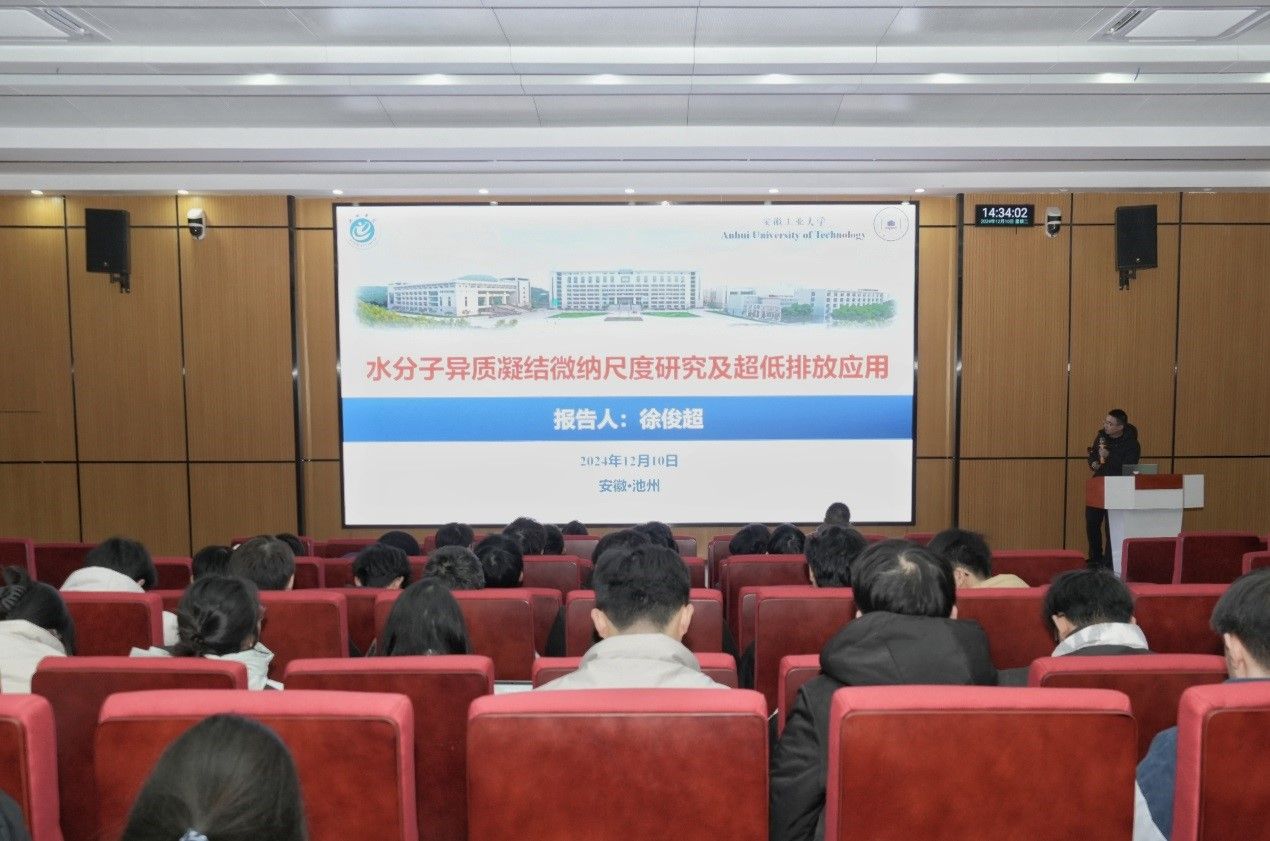 12月10日下午,材料与环境工程学院“党建引领发展,学术促进成长”学术大讲堂2024年第十四期(总第二十期)在best365手机版官方网站公共教学楼东报告厅举行。安徽工业大学能源与动力工程专业系主任徐俊超副教授作了题为“水分子异质凝结微纳尺度研究及超低排放应用”的学术报告。报告由环境工程教研室于磊博士主持,100余名师生代表参加了报告。