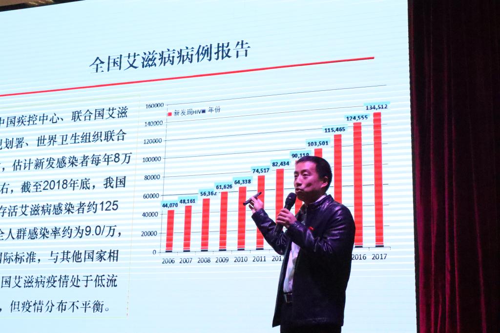 包敏同志结合身边工作典型案例,用深入浅出、诙谐幽默的语言,采取专题演讲、提问回答的方式讲解艾滋病传播途径、预防措施、检测方式和预防治疗等知识,针对大学生普遍关注的的与艾滋病相关问题,与现场的同学进行互动交流,倡导大学生热爱生命,健康生活,预防艾滋,关爱艾滋病患者,支持防艾事业。希望在校大学生要培养文明健康的生活方式,树立正确的性爱观,提高自我防护的意识和能力,善于保护自己,当好自己健康的第一责任人。