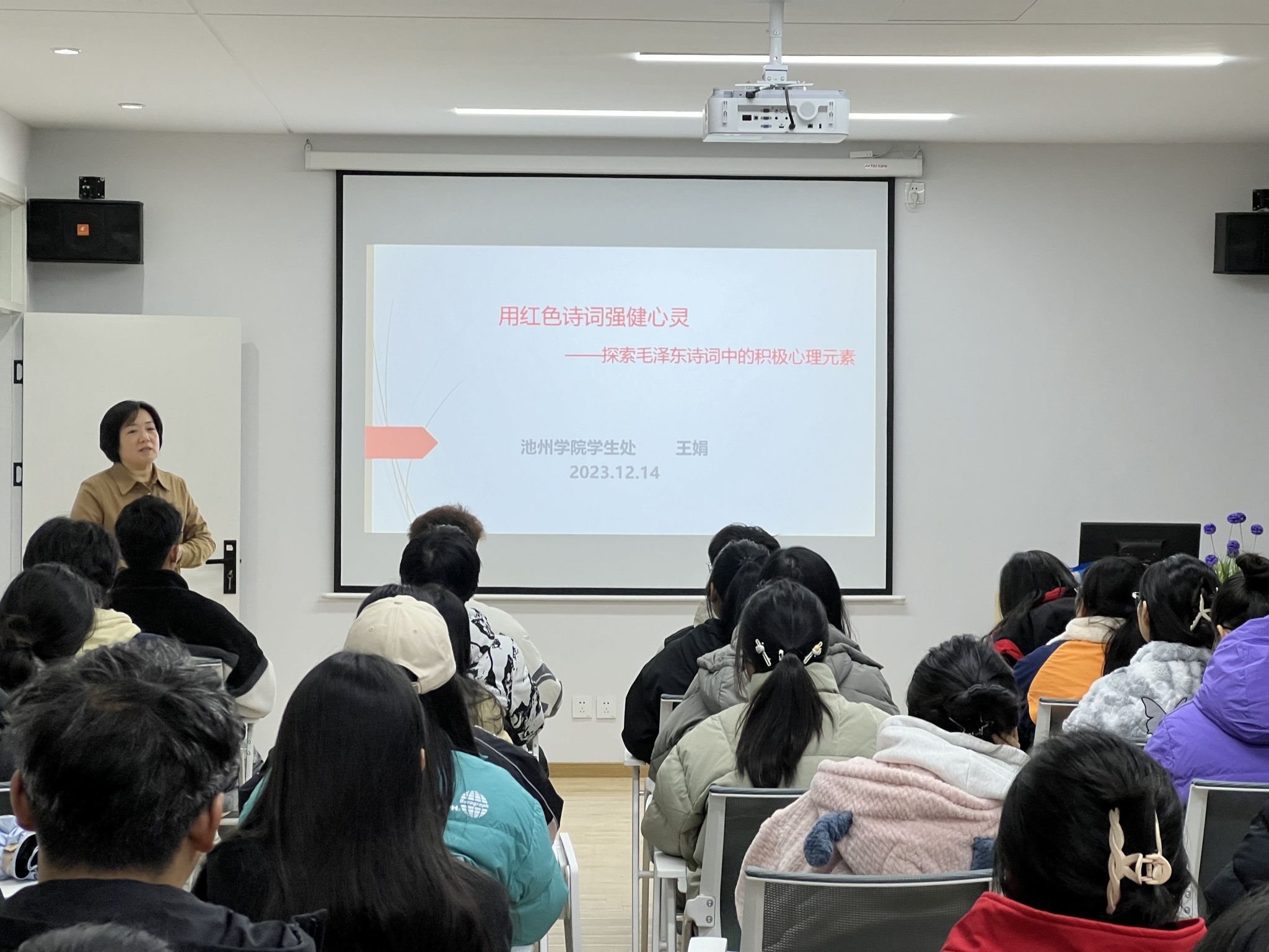 王娟从积极心理学含义、毛泽东诗词概述、毛泽东诗词中的积极心理元素、从毛泽东诗词看人生的五个对待、用红色诗词强健心灵等五个方面展开,引导同学们体会红色诗词文化的精神内涵,感受红色诗词中蕴含的强大力量,激发同学们对红色诗词的兴趣,鼓励同学们深入挖掘红色诗词中的积极心理元素,用红色文化为青春赋能。
