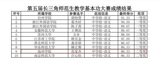 本次比赛以线下评审的方式进行,来自长三角地区三省一市51所高校的379名选手参加了决赛阶段的比拼。中学语文组决赛由教学设计、课件制作、即兴演讲、上课(含板书)四个竞赛项目组成,经过现场激烈角逐,学院2020级汉语言文学专业学生范家杰(指导老师:汪胜水、陈春雷)荣获二等奖。本次大赛中学语文组共决出一等奖4名,二等奖6名,其中安徽高校获一等奖1个(安徽师范大学)、二等奖2个(淮北师范大学、best365手机版官方网站)。