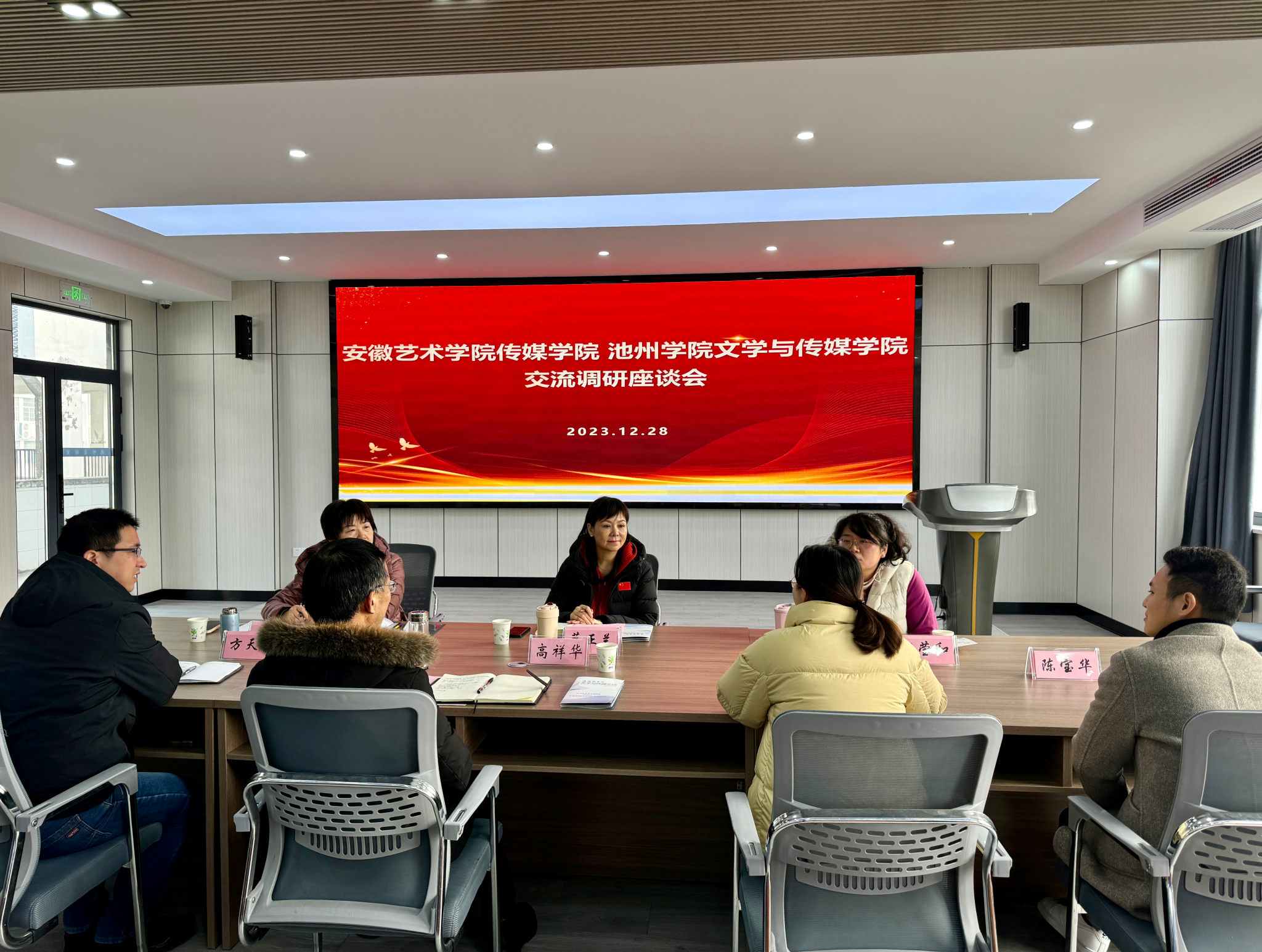 12 月 28 日上午,安徽艺术学院传媒学院蔡正兰院长一行到文学与传媒学院进行交流调研,双方就学科专业建设、人才培养等方面展开了深入交流。文学与传媒学院领导班子成员及相关教师参加了交流调研座谈会。