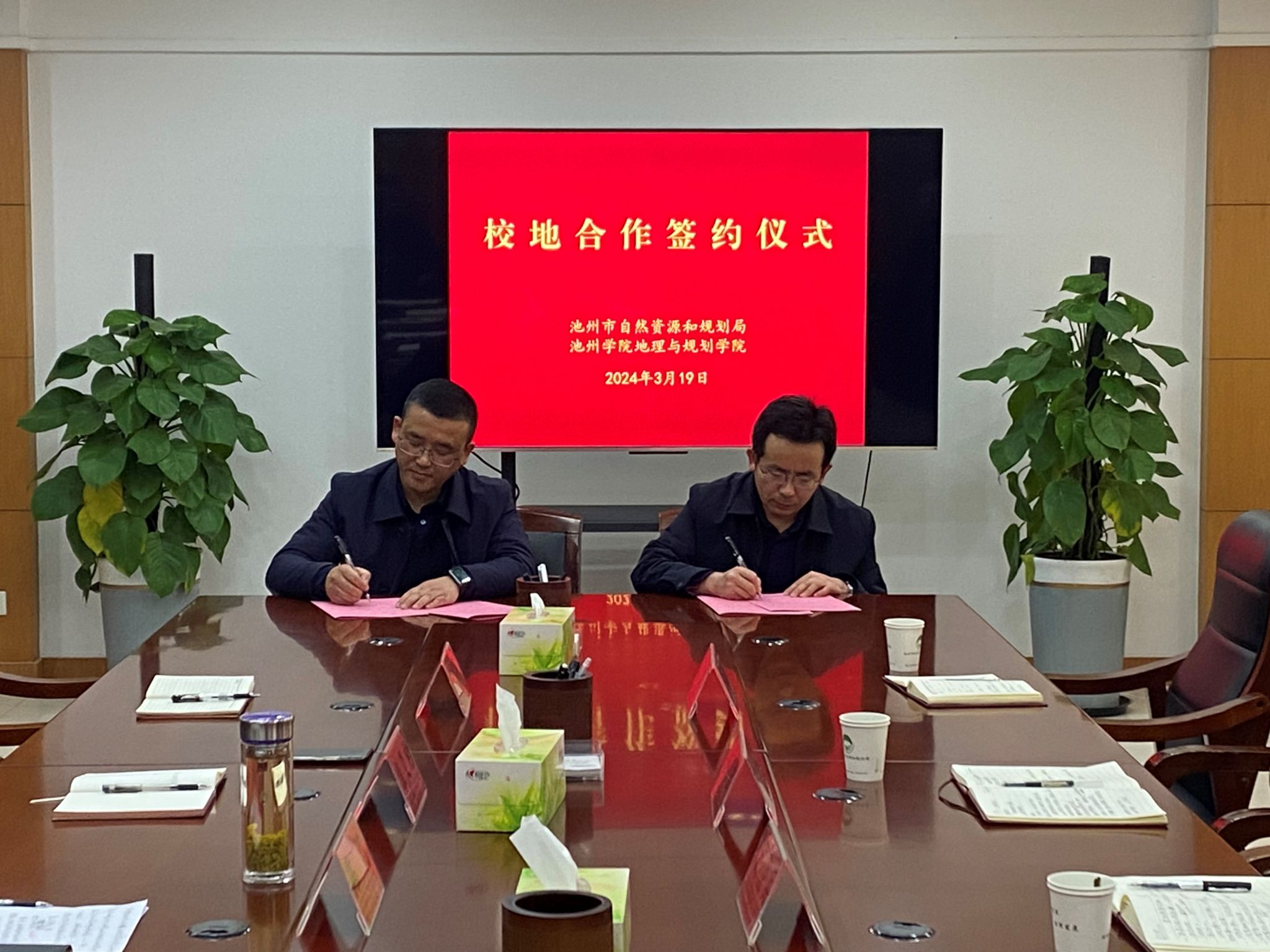 3月19日,地理与规划学院党委书记许卫兵、院长张乐勤、副院长姚志强、城乡规划教研室主任纪凯婷及王文琴副教授一行赴池州市自然资源和规划局交流并签订校地合作框架协议。市自然资源和规划局党组书记、局长陈涛主持会议。市自然资源和规划局党组成员章义柏、章杰、三级调研员章宜笙,省地质矿产勘查局324地质队、市规划勘测设计总院、市自然资源卫星中心等负责同志出席会议。