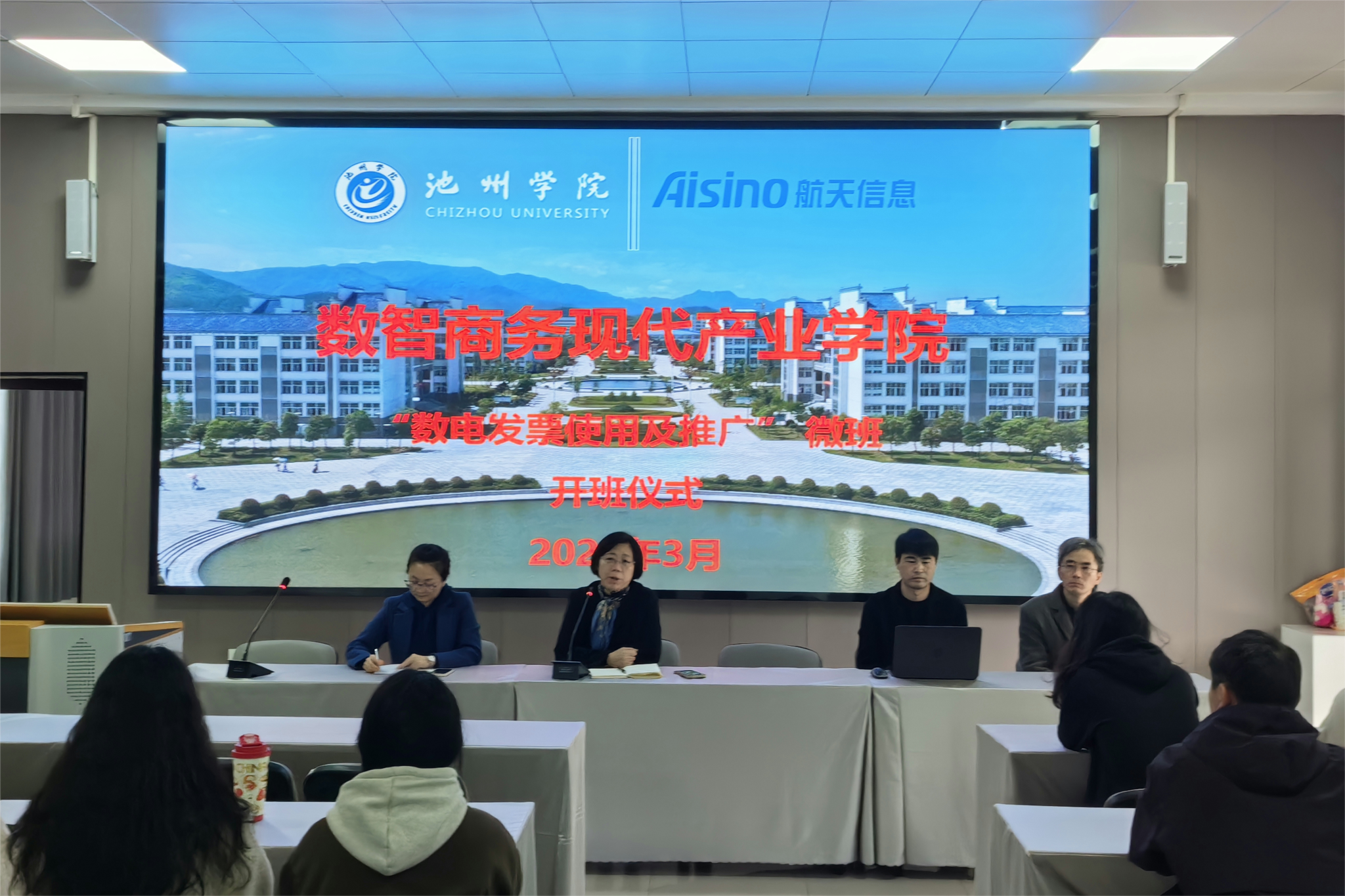 3月26日上午,商学院和安徽航天信息科技有限公司联合共建的“数电发票使用及推广”微班开班仪式在商学院博识北401教室举行。商学院院长项桂娥教授、副院长吴义根教授、航天信息科技有限公司李琴、胡凯讲师出席,仪式由会计学教研室主任谭庆主持。