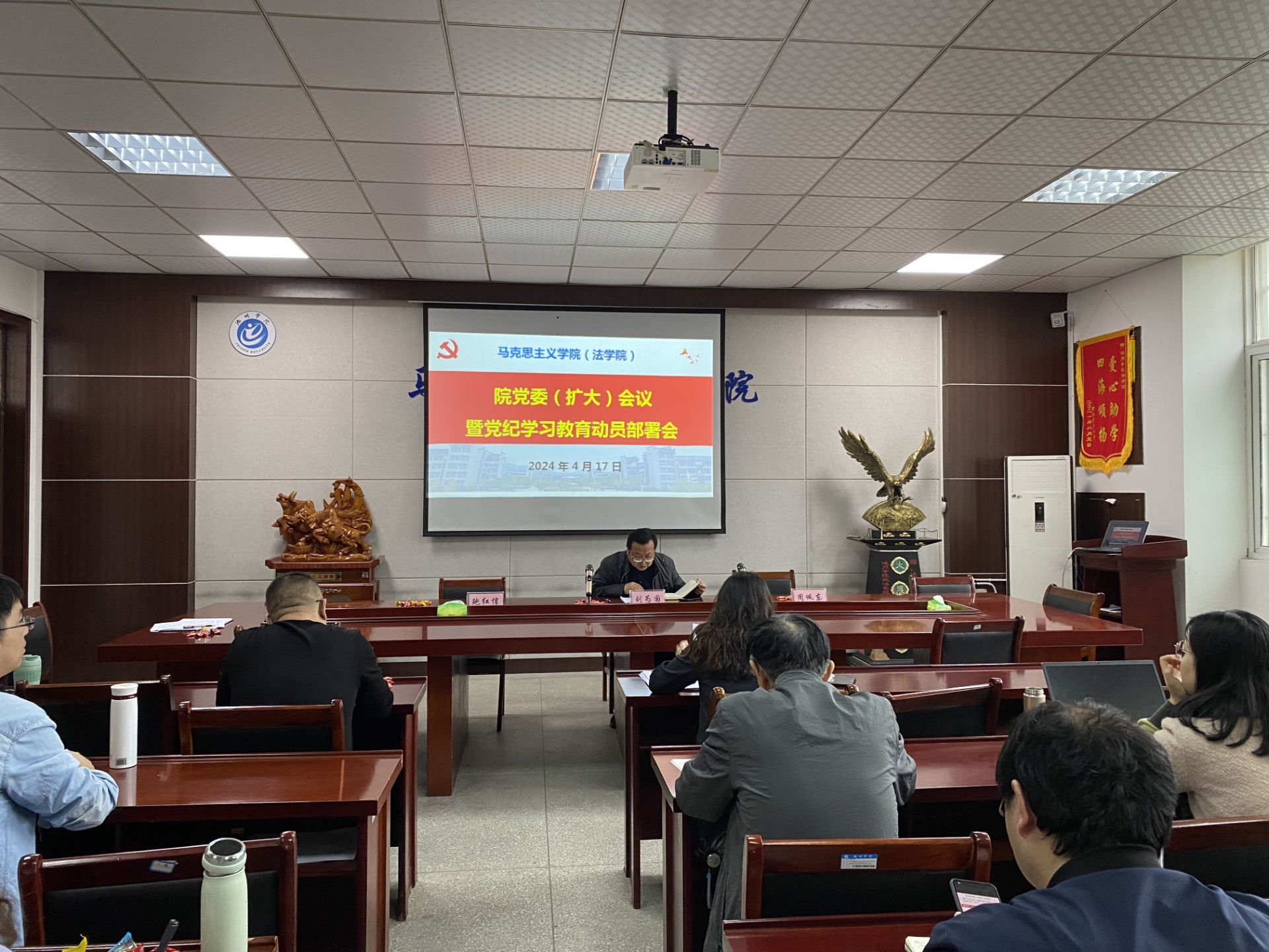4月17日下午,马克思主义学院在博爱南二楼会议室举行党委(扩大)会,动员部署学院党纪学习教育工作。马克思主义学院领导班子成员、党支部书记、教工党员参加会议。会议由学院党委书记刘为国主持。