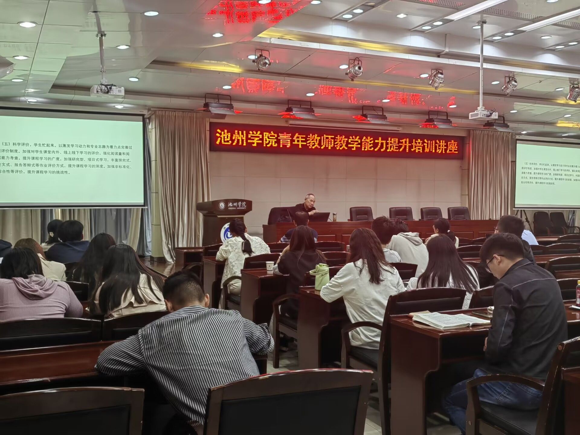 5月8日下午,教务处、人事处联合组织开展2023-2024学年教师教学能力提升系列讲座,邀请安徽师范大学教育科学学院孙德玉、周兴国教授分别做题为“新时代高校教师师德师风建设”“高校教师教学基本规范”的专题报告,近三年新进教师90余人参加了培训,教务处副处长周恺主持了培训讲座。