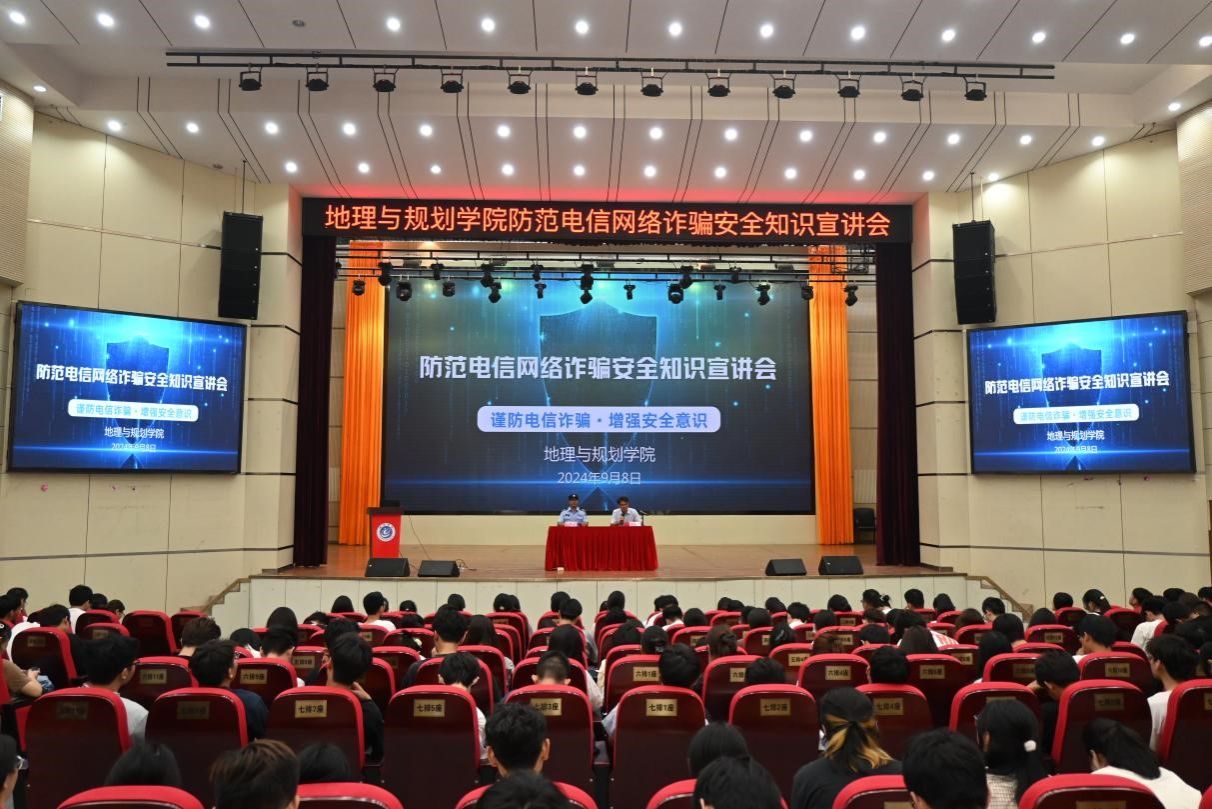9月8日,地理与规划学院在博古楼礼堂召开了防范电信网络诈骗安全知识宣讲会。池州市公安局贵池分局马衙派出所驻校民警陶德兵以“谨防电信诈骗 增强安全意识”为题作宣讲报告,会议由地理与规划学院党委副书记何小青主持。