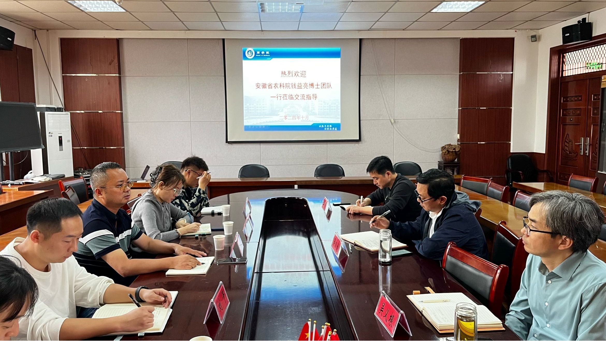 10月12日上午,安徽省农业科学院作物研究所钱益亮博士团队及黄山壹贰叁农科文化创意有限公司一行6人来商学院(法学院)考察交流产学研平台建设及农科产品全渠道零售合作建设发展情况。商学院(法学院)院长吴自爱主持考察交流会。副院长吴义根、电子商务教研室主任王剑程及相关教师参加会议。