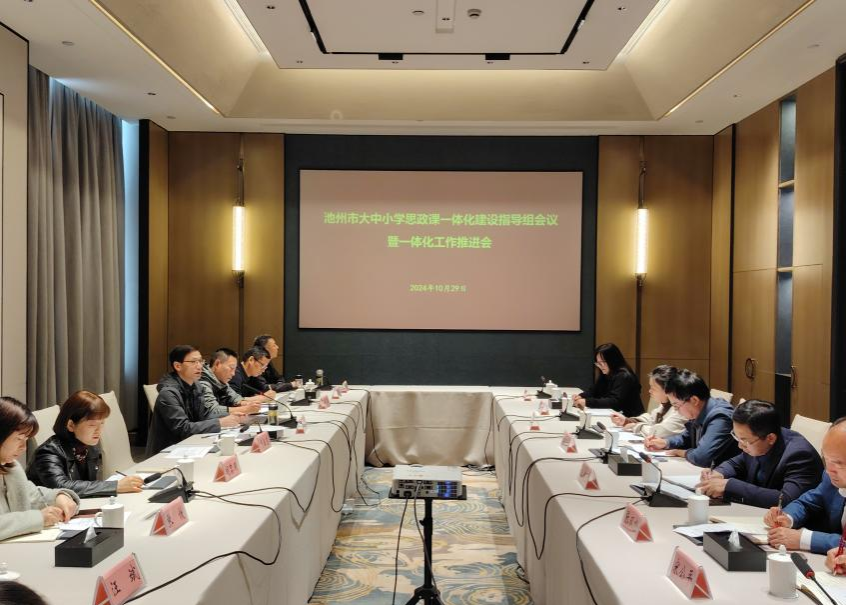 10月29日,池州市大中小学思政课一体化建设指导组会议暨一体化工作推进会在市大九华宾馆召开。池州市教育和体育局教师发展中心(教研室)主任詹春慧、best365手机版官方网站马克思主义学院副院长鲍红信以及池州市中小学思政课一体化共同体成员等参加会议。