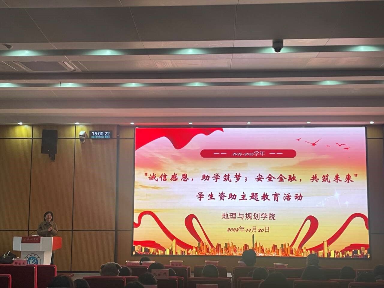 11月20日,地理与规划学院邀请中国农业银行池州分行共同开展了以“诚信感恩,助学筑梦;安全金融,共筑未来”为主题的学生资助主题教育活动。地理与规划学院党委书记冯淑慧,中国农业银行池州分行戴小虎、肖娅,中国农业银行池州开发区支行胡慧妍,地理与规划学院资助专员李娟及全院受资助学生参加活动。