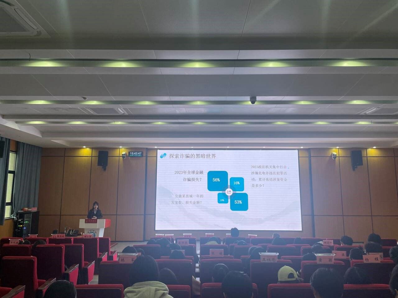 胡慧妍以“智青春,让诈骗终将逝去”为主题进行反诈宣讲。她通过生动形象的案例分析和互动问答环节,向同学们详细讲解了金融诈骗的常见手段、网络借贷的风险与陷阱等,让同学们对金融安全知识有了更深入的了解,提高了自身的风险防范意识和金融素养。
