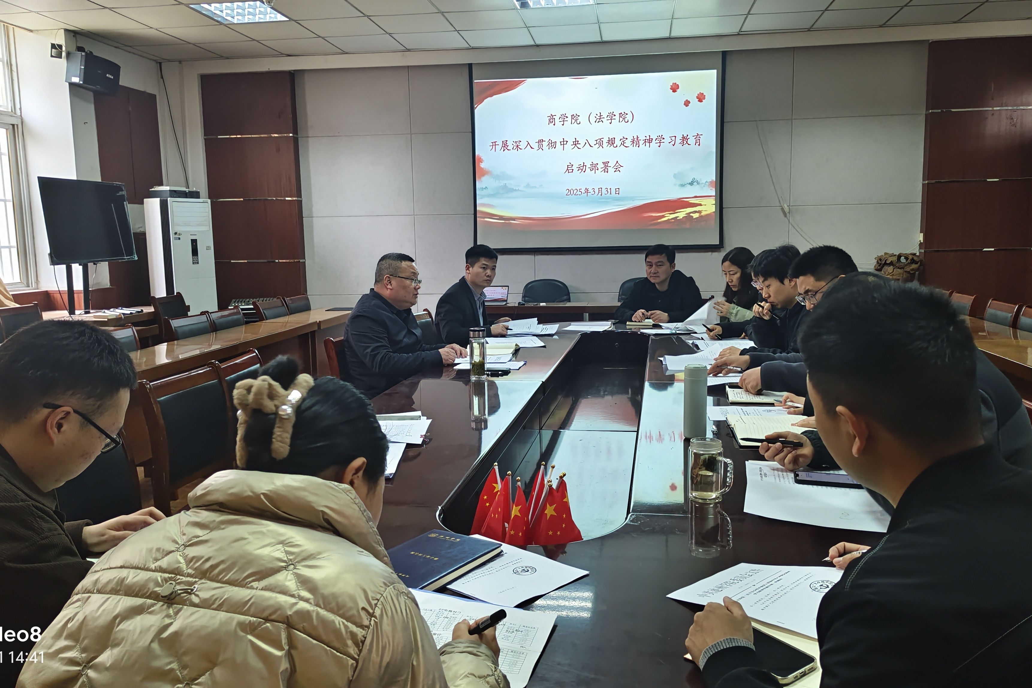 3月31日,商学院(法学院)召开深入贯彻中央八项规定精神学习教育启动部署会。学院党委书记肖宁生主持会议,班子成员、党委委员、各支部书记、科级干部、专职辅导员参加会议。