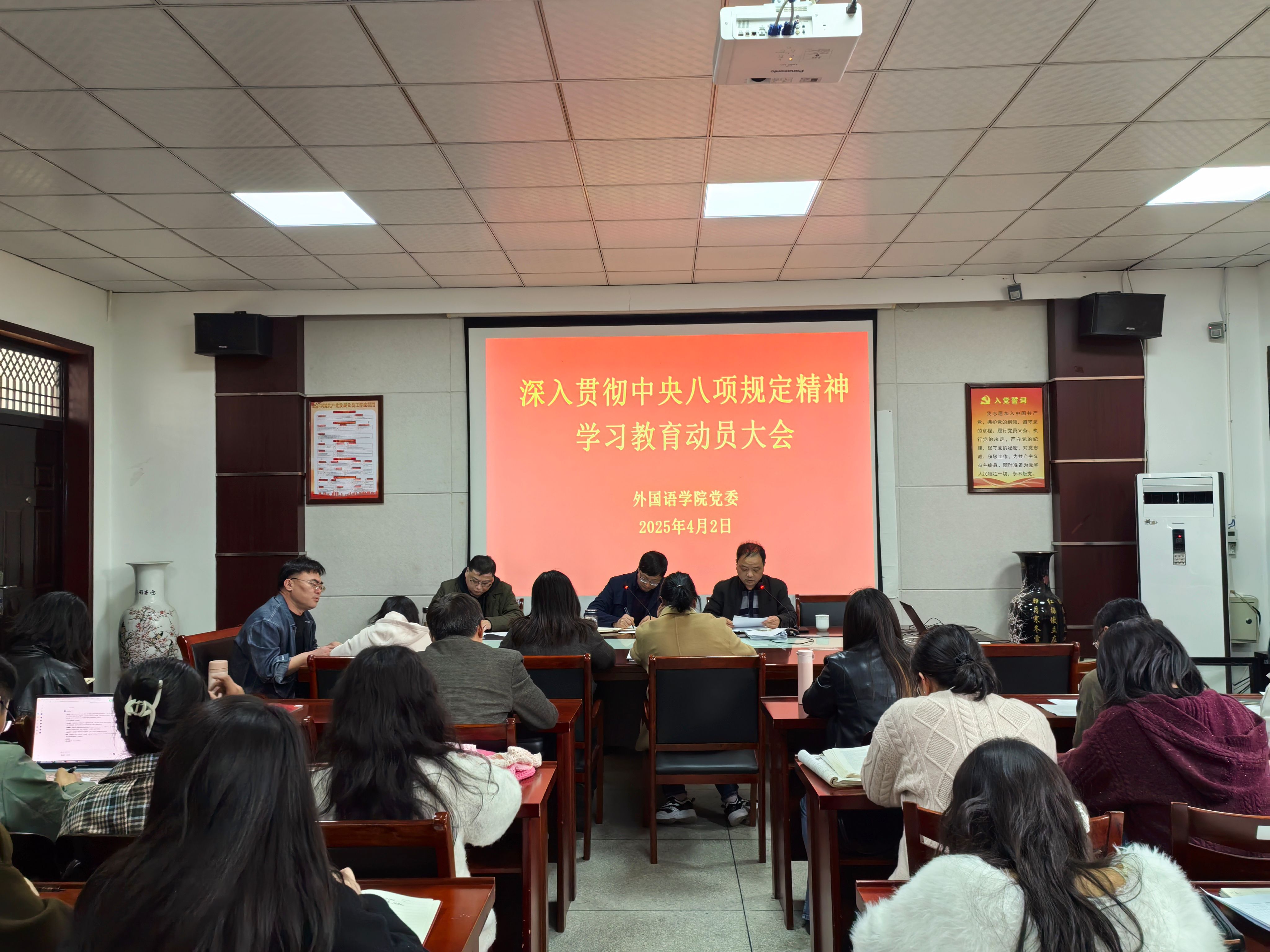 4月2日,外国语学院在学院会议室举行深入贯彻中央八项规定精神学习教育动员大会,学院全体教师党员参加会议,会议由外国语学院党委副书记、院长余义兵主持。