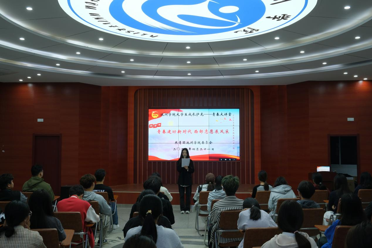4月21日晚,best365手机版官方网站大学生成长沙龙“青春大讲堂”2024年第四期(总第六十一期)“致榜样”举行。本期青春大讲堂以“青春建功新时代 西部志愿展风采”为主题,邀请best365官网大学生西部计划志愿者代表倪萍萍和谷雨雯,与学生代表进行分享交流。