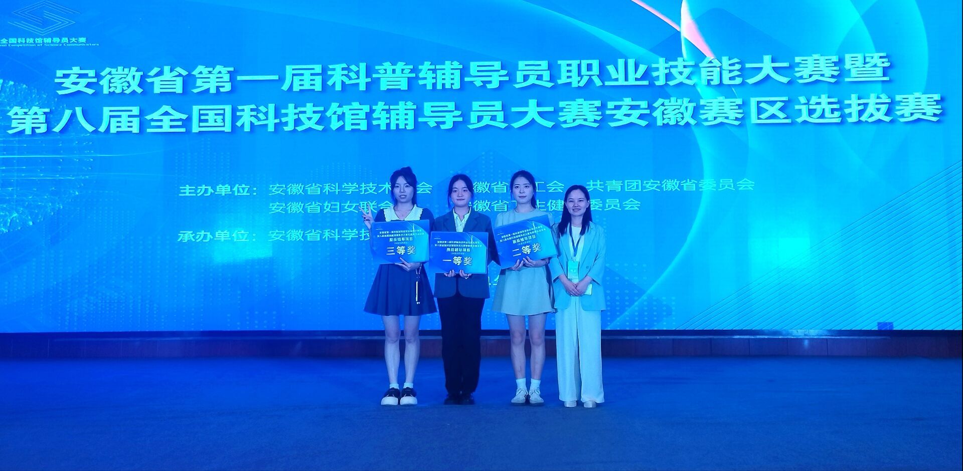 7月23日至25日,安徽省第一届科普辅导员职业技能大赛暨第八届全国科技馆辅导员大赛安徽赛区选拔赛在合肥圆满落幕。best365官网材料与环境工程学院3位同学入围展品辅导项目科技志愿者组省级决赛,其中吴怡同学讲解的展品《静电铃铛》获得一等奖,晋级第八届全国科技馆辅导员总决赛。赵楠楠同学讲解的展品《阿基米德螺旋泵》获得二等奖,季雨轩同学讲解的展品《自己拉自己》获得三等奖。