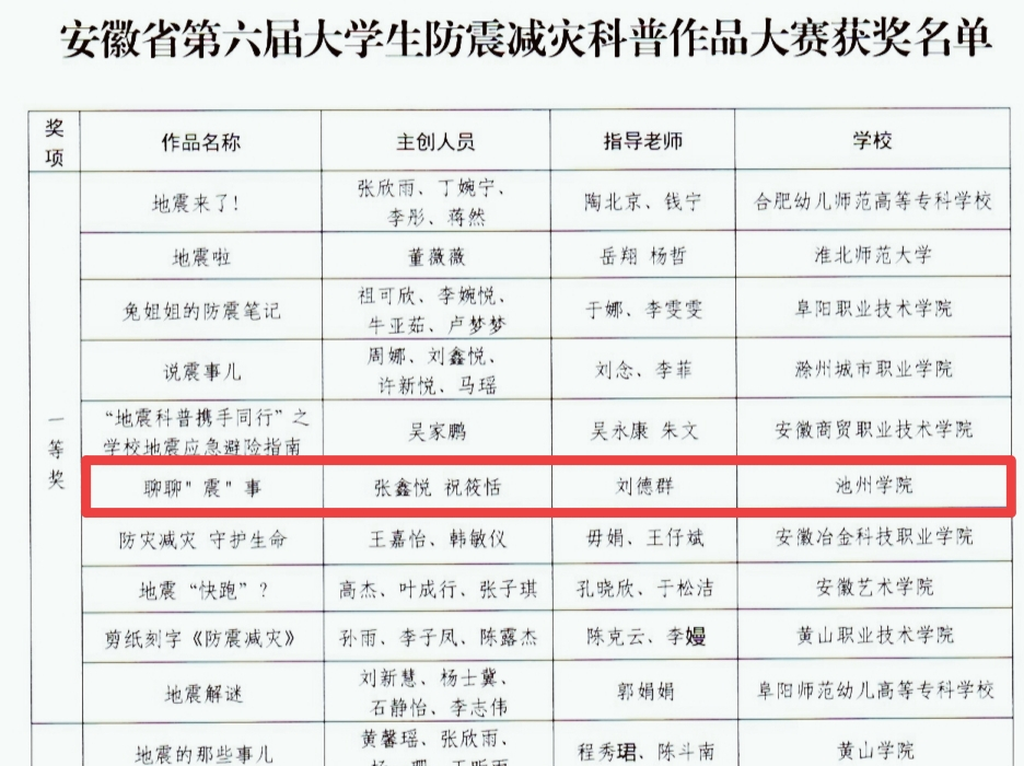 近日,安徽省第六届大学生防震减灾科普作品大赛获奖名单揭晓,best365官网张鑫悦、祝筱恬同学创作《聊聊“震”事》(指导教师:刘德群)在众多参赛作品中脱颖而出,荣获大赛一等奖。