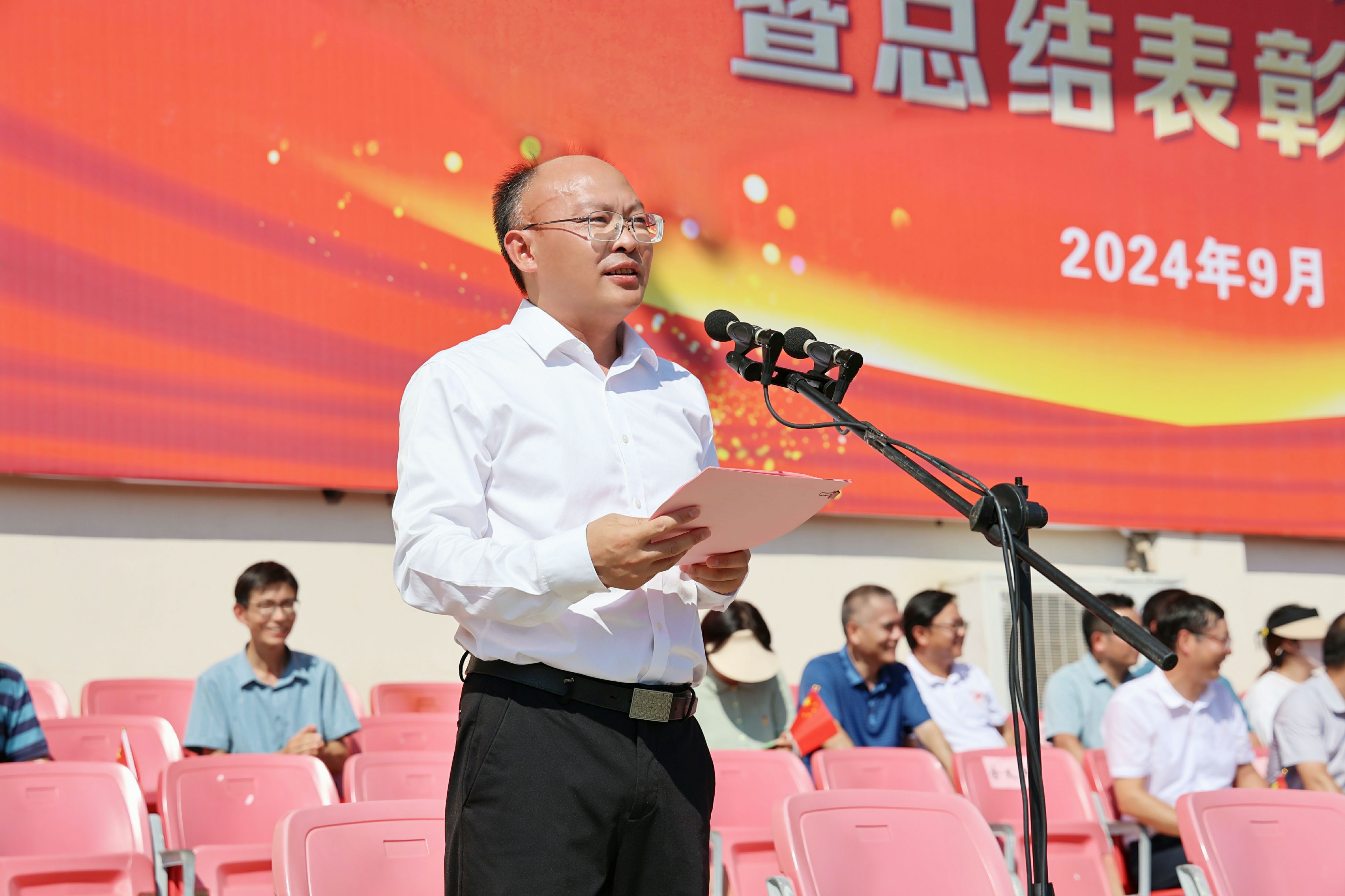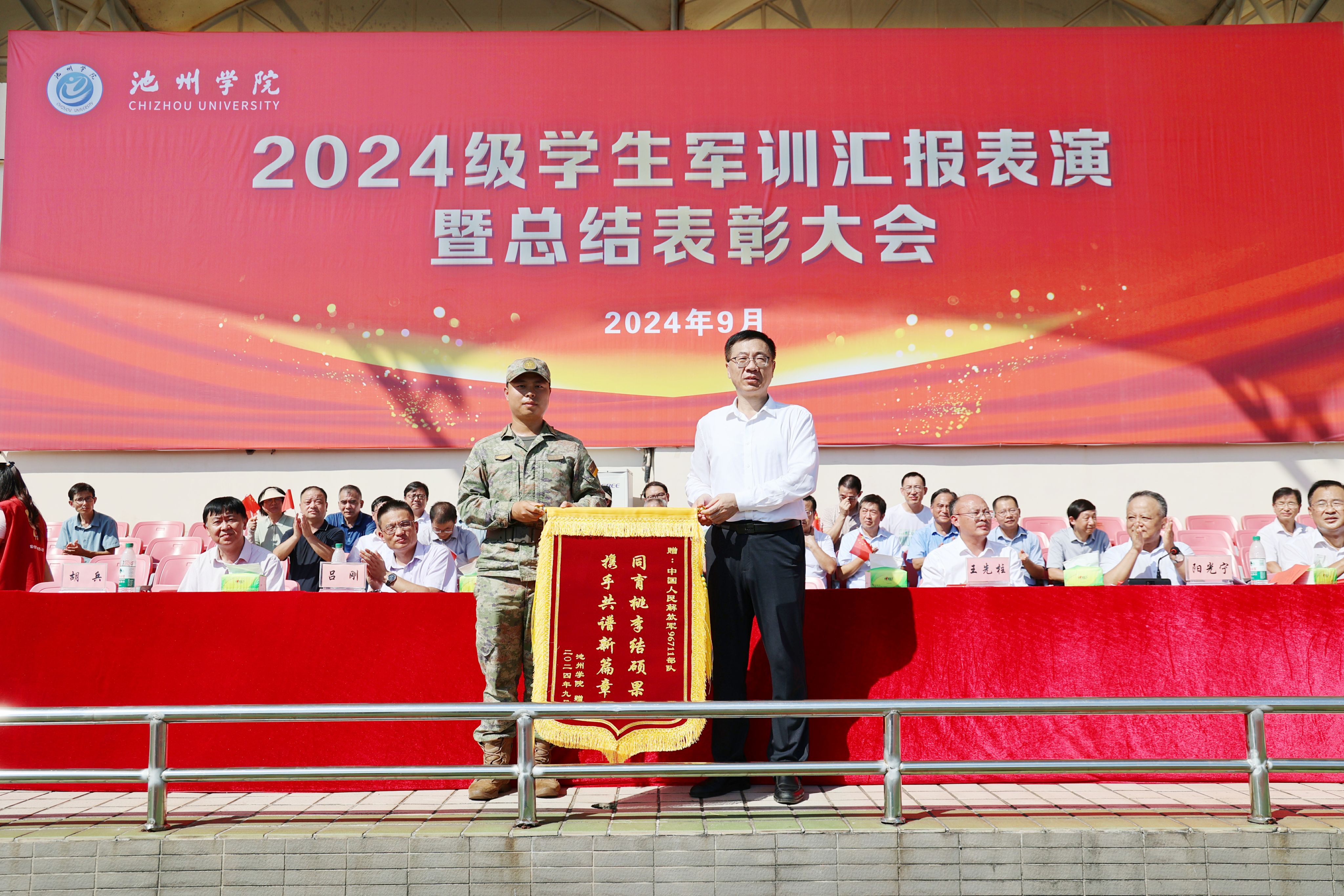 9月30日上午,学校举行2024级新生军训汇报表演暨总结表彰大会。校党委书记王峰向承训部队赠送锦旗,校党委副书记、校长王先柱作总结讲话。校党委班子成员阳光宁、吕刚、张赛、胡兵及承训部队上尉周梓曦在主席台就坐。大会由校党委委员、副校长阳光宁主持。