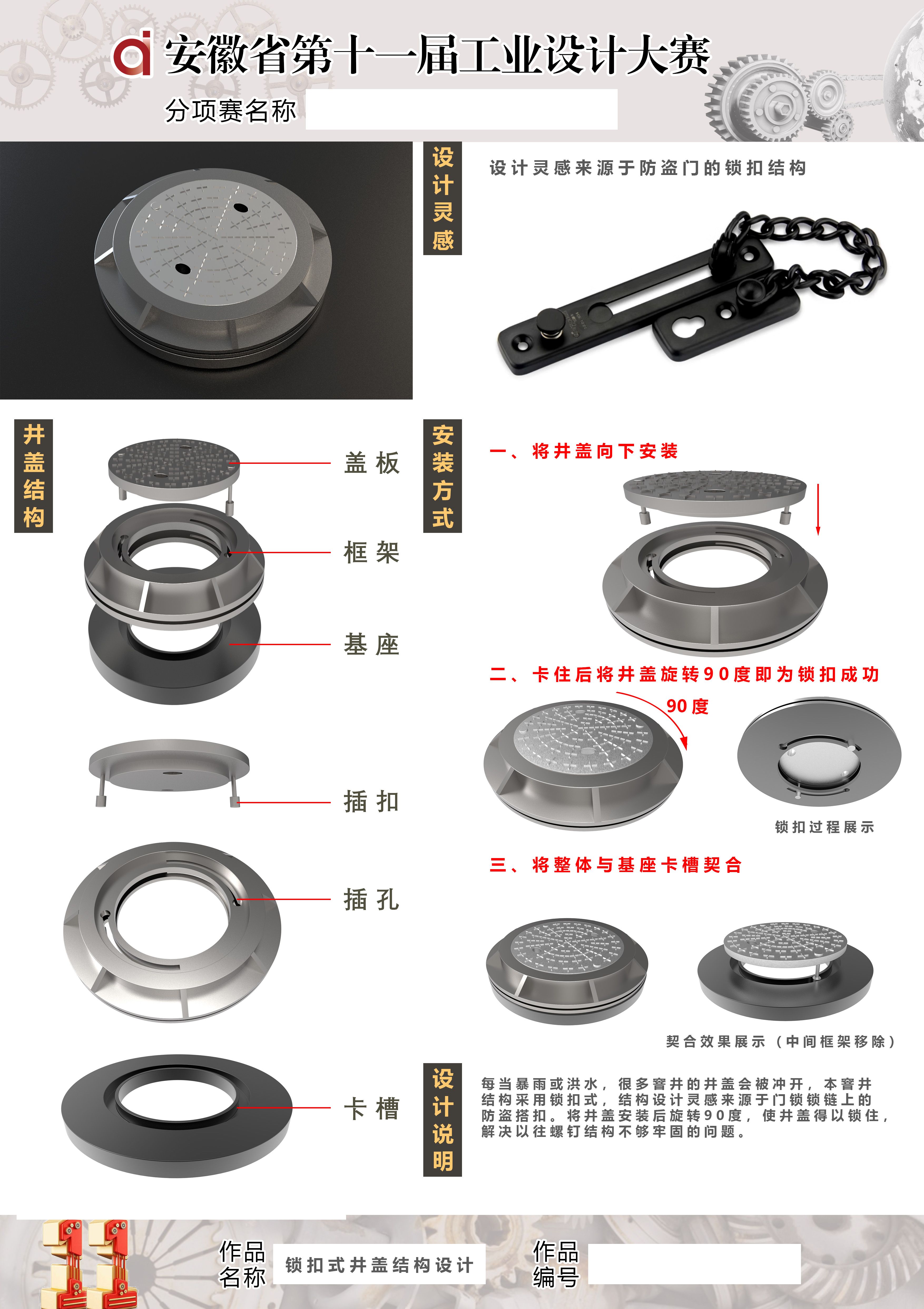 本专项赛主要内容为井盖的结构与功能设计,旨在解决窨井盖普遍存在位的移、下沉、凸起等各种难点问题,从而美化城市形象,提高人民的美好生活。《井盖结构设计》采用锁扣式结构,设计灵感来源于门锁锁链上的防盗搭扣,将井盖安装后旋转90度,使井盖得以锁住,解决以往螺钉结构不够牢固的问题。