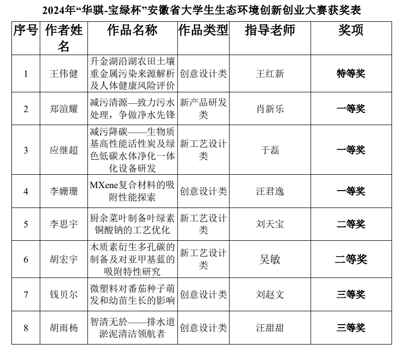 11月15日至16日,“华骐-宝绿杯”第七届安徽省大学生生态环境创新创业大赛在蚌埠学院举办。best365官网学生荣获特等奖1项、一等奖3项、二等奖2项、三等奖2项,学校荣获优秀组织奖,指导老师王红新、肖新乐、于磊和汪君逸老师获得“优秀指导教师”荣誉称号。