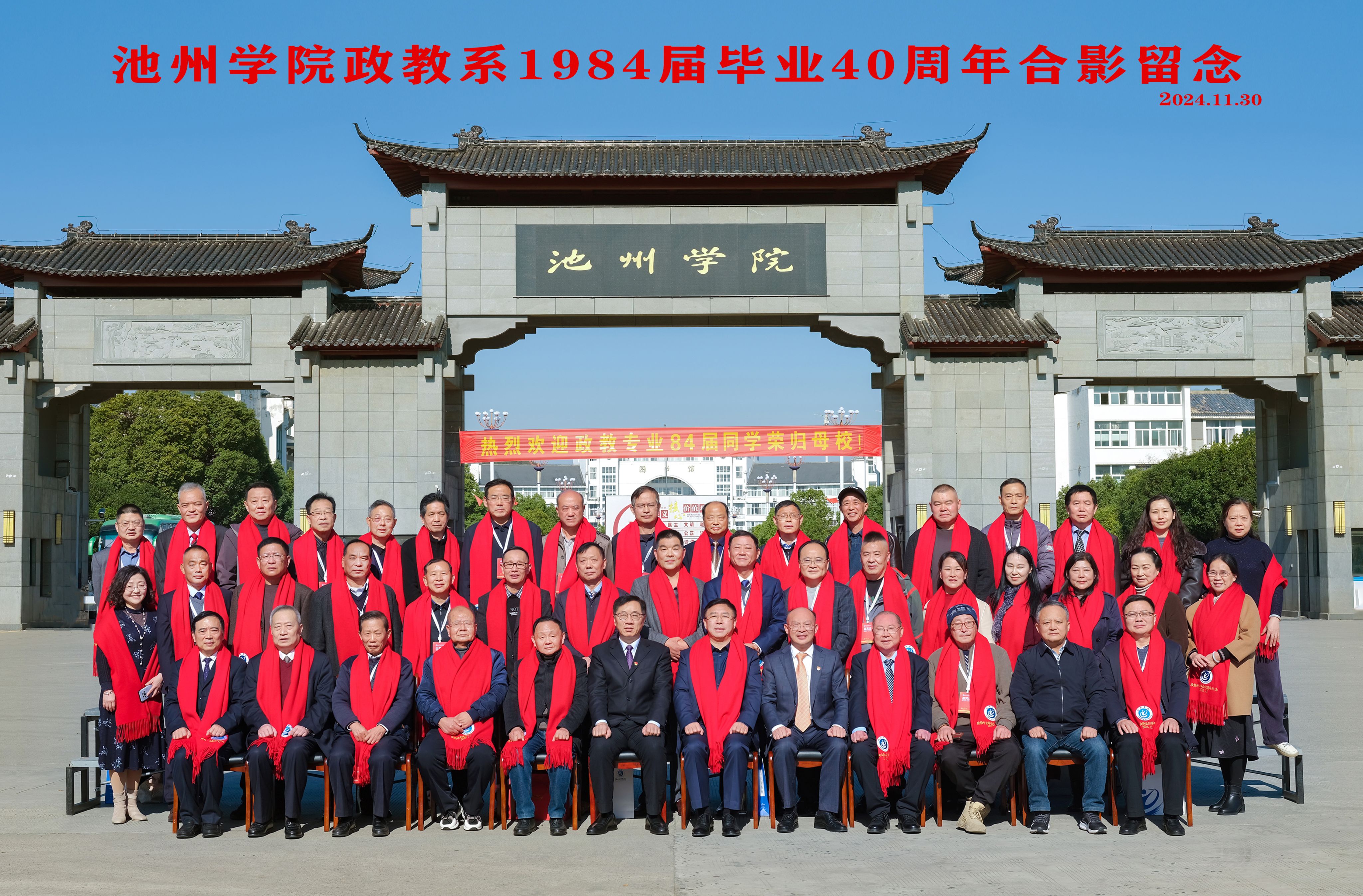 班会结束后,校领导和84届政教专业校友在学校南大门合影留念。