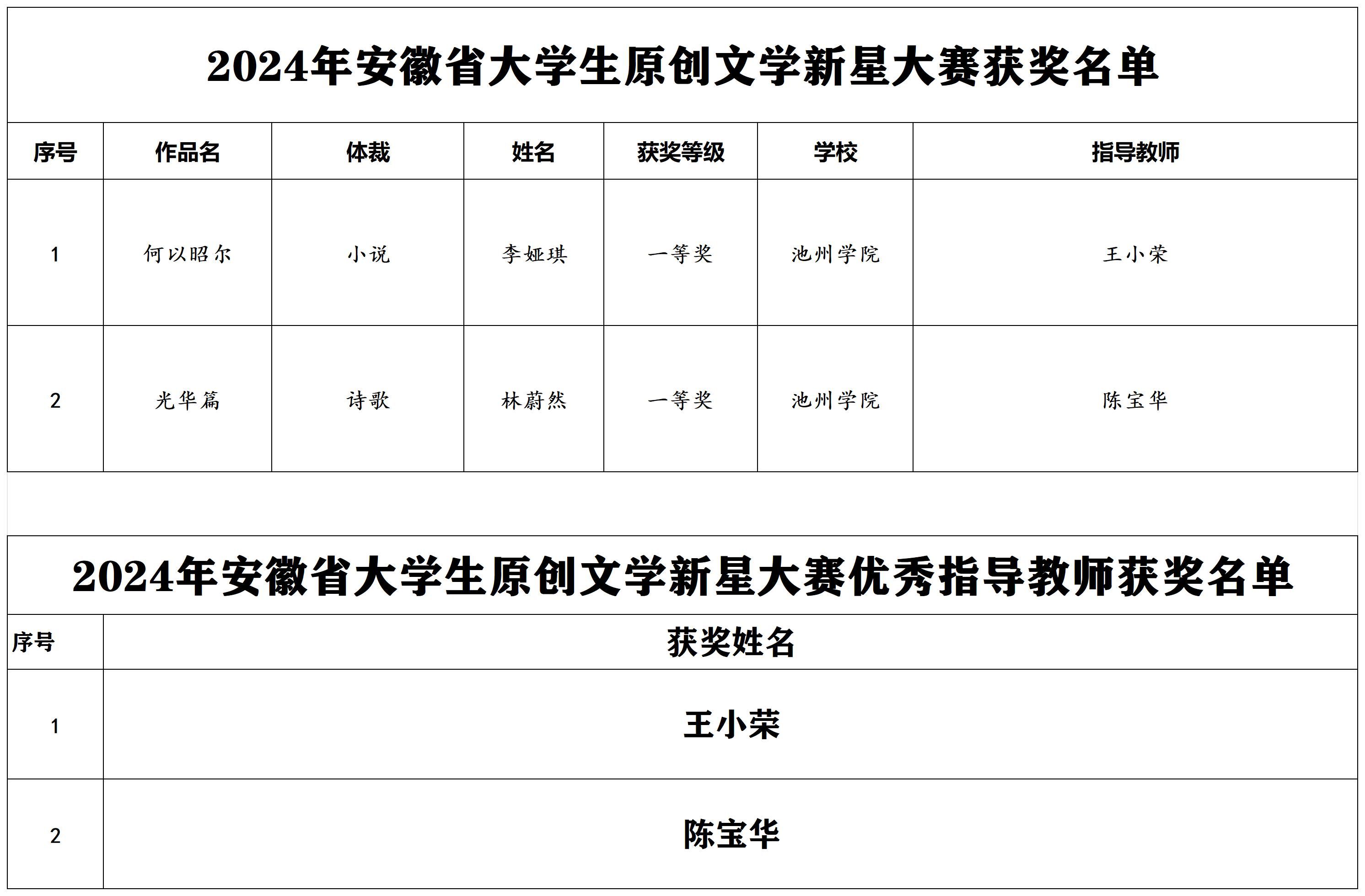 12月18日,2024年安徽省大学生原创文学新星大赛落下帷幕。best365官网文学与传媒学院学子荣获一等奖2项,王小荣、陈宝华老师荣获“优秀指导教师”称号。