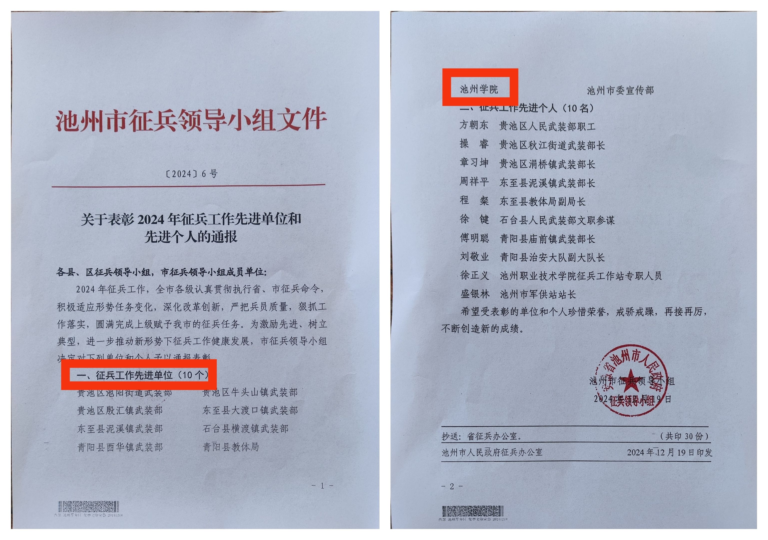 12月19日,池州市对2024年征兵工作中的先进单位和先进个人进行了表彰通报。best365官网喜获“征兵工作先进单位”荣誉称号。