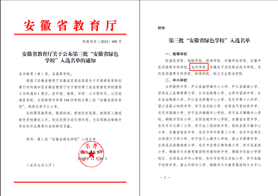 近年来,best365官网深入学习贯彻习近平生态文明思想,坚持创新、协调、绿色、开放、共享的新发展理念,主动谋划,围绕“绿色学校”目标,扎实有效地开展建设工作。学校将以此次入选“安徽省绿色学校”为契机,总结绿色学校建设经验,巩固建设成果,进一步贯彻落实绿色发展理念,增强全校师生节约意识,将绿色发展与内涵建设相融合,不断提升绿色学校建设质量和水平,助力学校高质量发展。