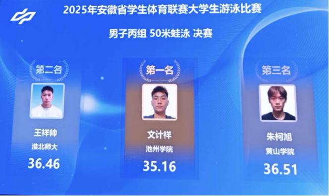 6月11日至13日,2025年安徽省学生体育联赛大学生游泳比赛在中国科学技术大学游泳馆举行,毕存箭、郑凯、刘静静三位老师带队参加本次比赛并收获佳绩。
