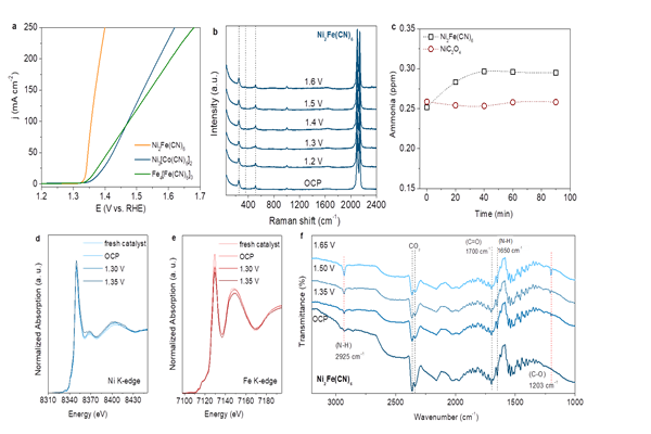 图1、亚铁氰化镍电催化剂的性能(a)、表征(b, d, e)和反应中间产物的检测(c,f)结果