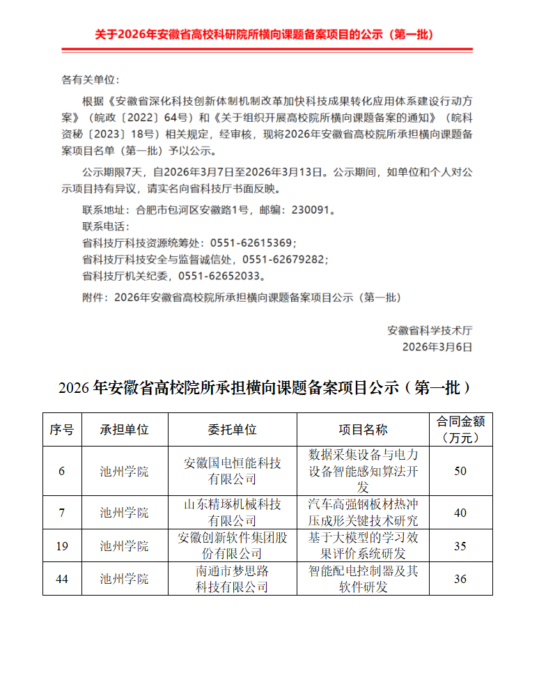 近日,安徽省科技厅正式公布2026年安徽省高校科研院所横向课题备案项目名单(第一批),best365官网4项聚焦产业技术攻关的科研课题成功获批立项。此次备案课题紧密对接电力装备、汽车制造、人工智能、智能配电等企业产业需求,通过校企合作研发,精准攻克技术难题,借助科技创新支撑地方产业进步,持续释放校地企协同创新效能。