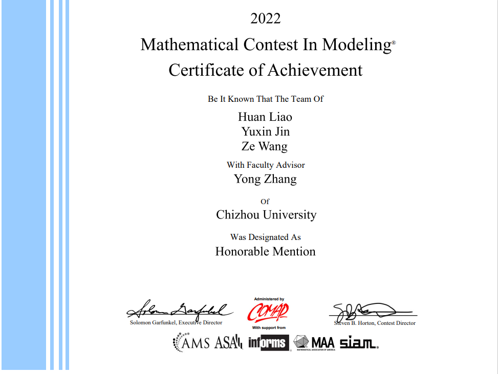 近日,2022年美国大学生数学建模竞赛成绩揭晓,best365官网四支参赛队获得H奖1项、S奖3项的成绩。其中,由大数据与人工智能学院王泽团队(指导教师:张永)获得了H奖。