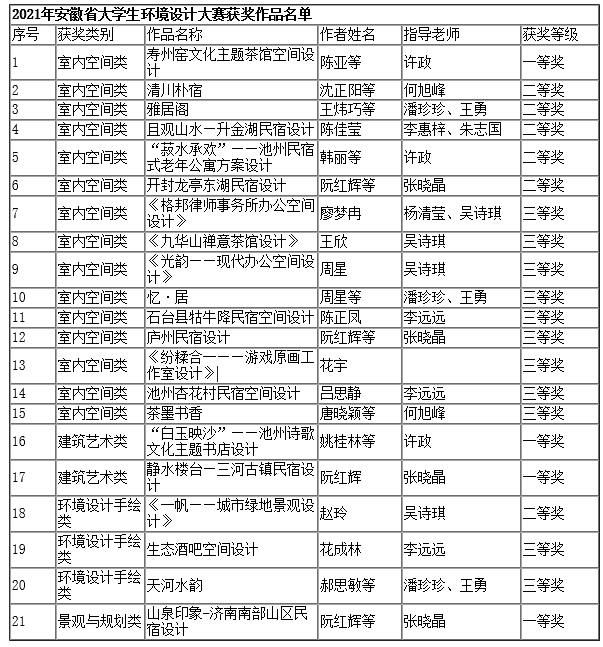 由安徽省教育厅主办、安徽工程大学承办的“2021年第三届安徽省大学生环境设计大赛”评审圆满结束,best365官网学生作品从全省60多所高校2855件作品中脱颖而出,再次斩获一等奖4项、二等奖6项、三等奖11项。