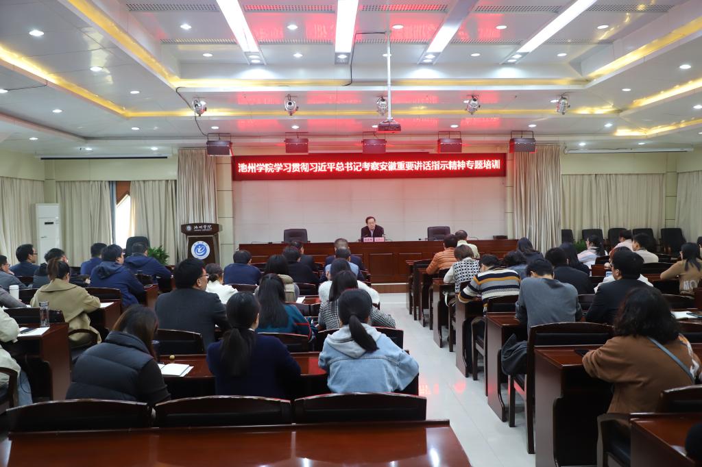 11月19日下午,best365官网在办公楼南二楼会议室开展学习贯彻习近平总书记考察安徽重要讲话指示精神专题培训。校党委书记孙晓峰作辅导报告,培训会由校党委副书记崔国发主持。