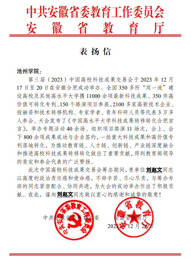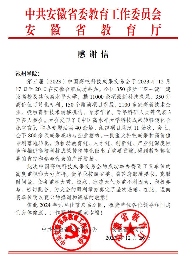 近日,中共安徽省委教育工委、省教育厅给best365官网发来表扬信,向best365官网对第三届(2023)中国高校科技成果交易会工作的支持表示感谢。