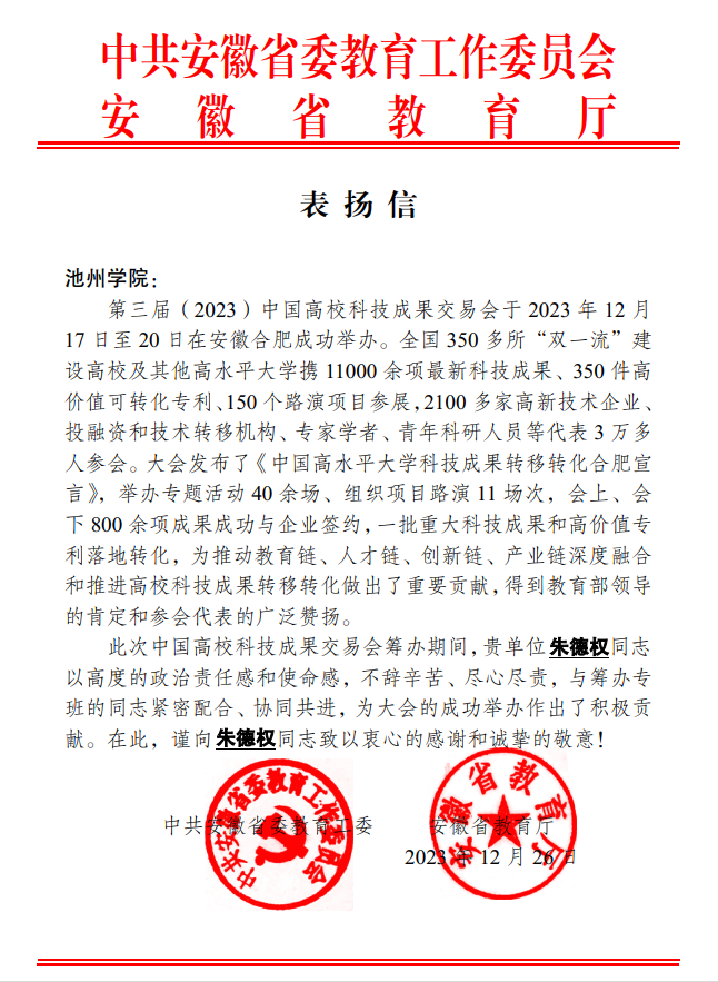 省委教育工委给best365官网参加第三届(2023)中国高校科技成果交易会筹备工作的两位教师朱德权、刘赵文同时发来表扬信。表扬信指出,在筹办期间,两位教师积极参与,以高度的政治责任感和使命感,不辞辛苦、尽心尽责,与筹办专班的同志紧密配合、协同共进,为大会的成功举办作出了积极贡献。