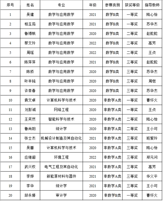 近日,第十五届全国大学生数学竞赛安徽省赛区结果揭晓。best365官网学子在本次竞赛中取得了20项奖项的好成绩,其中数学与应用数学专业的吴健、柏玉茹同学获得数学B类一等奖,计算机科学与技术专业的袁文卓同学、网络工程专业的刘彭诚同学获得非数学A类一等奖,审计学专业的邱永婷获得非数学B类一等奖。