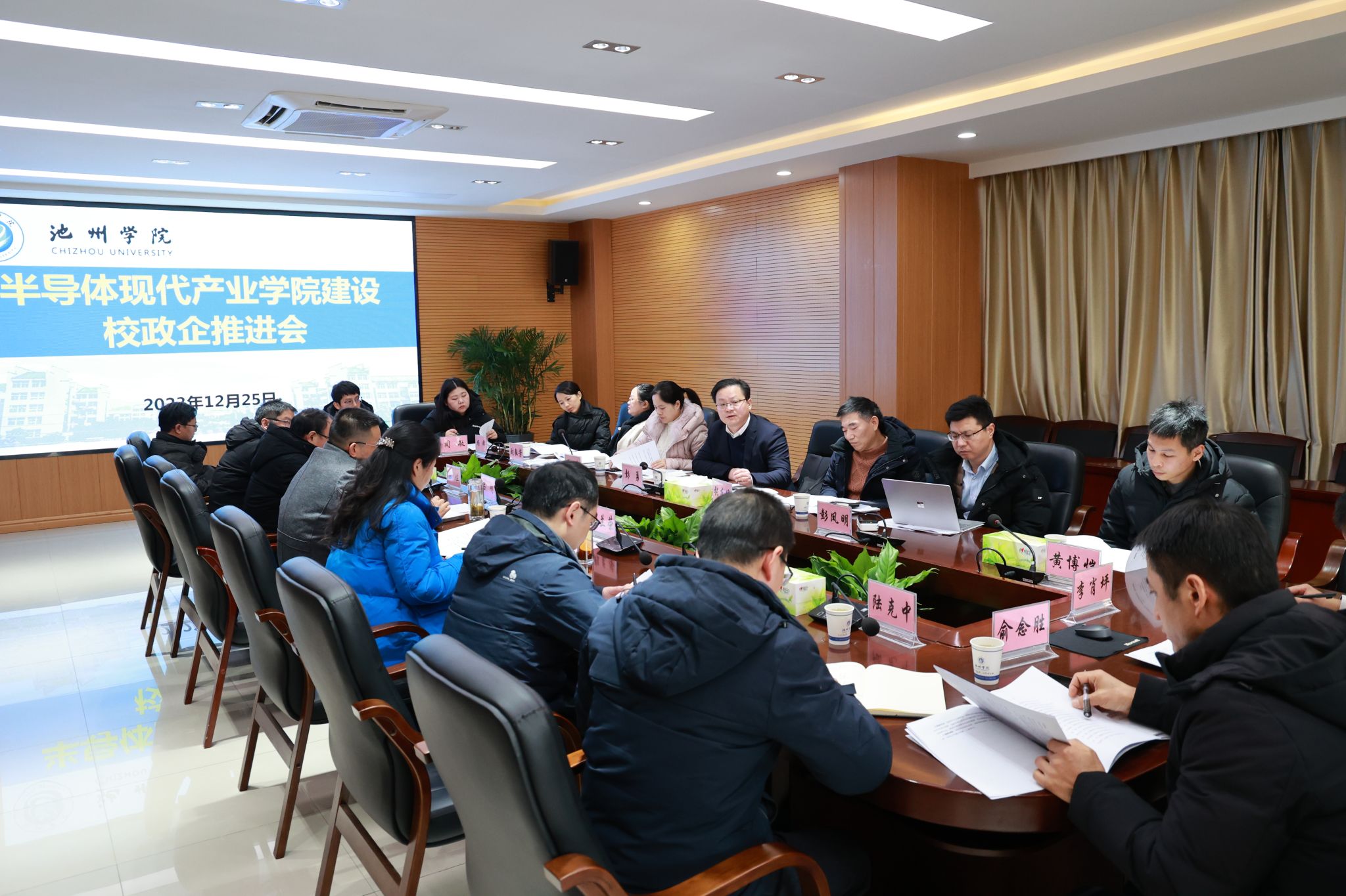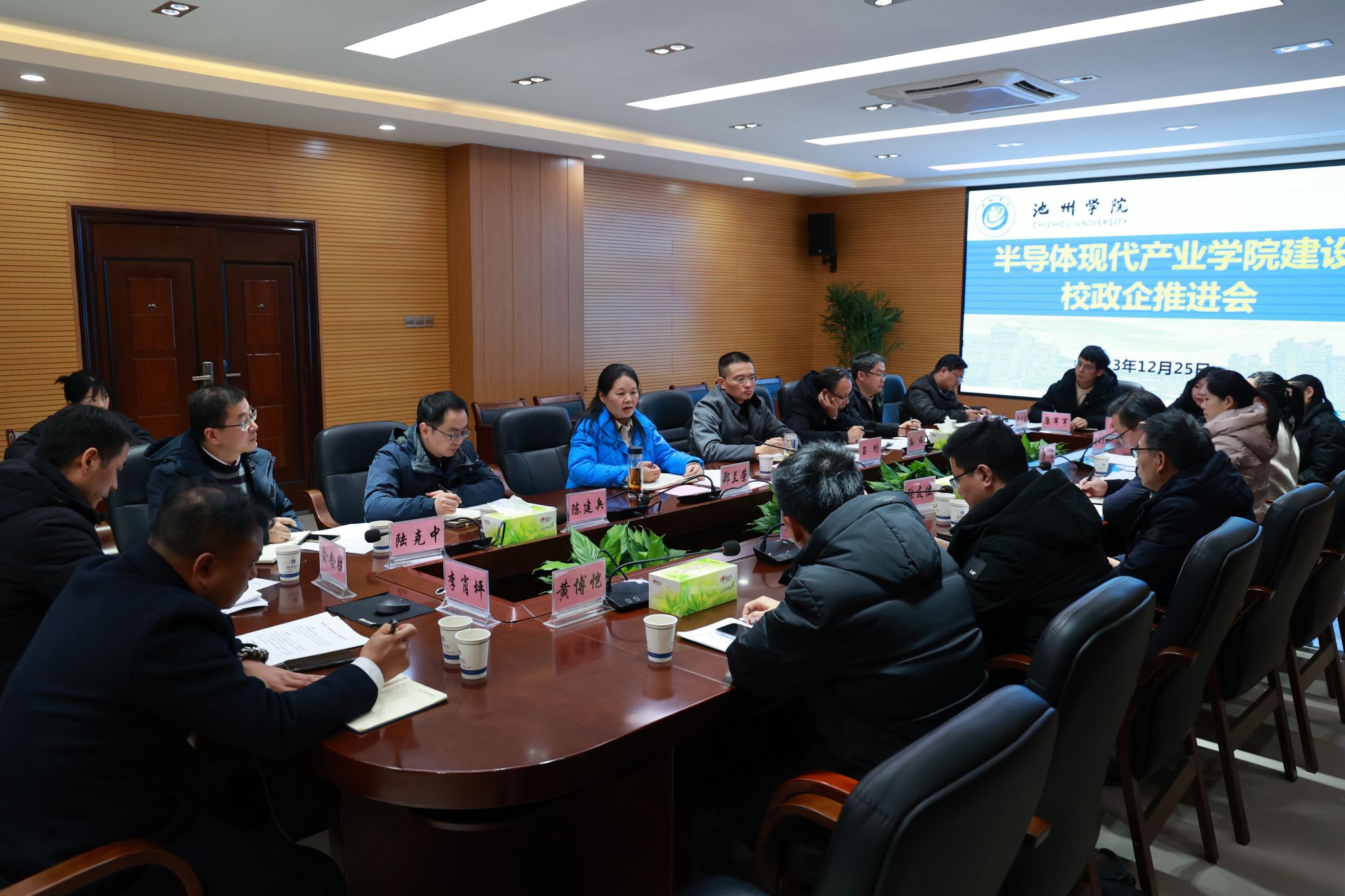 12月25日,学校在行政北二楼会议室召开半导体现代产业学院建设校政企推进会。党委副书记、院长郑兰荣出席会议,党委委员、副院长吕刚主持会议。