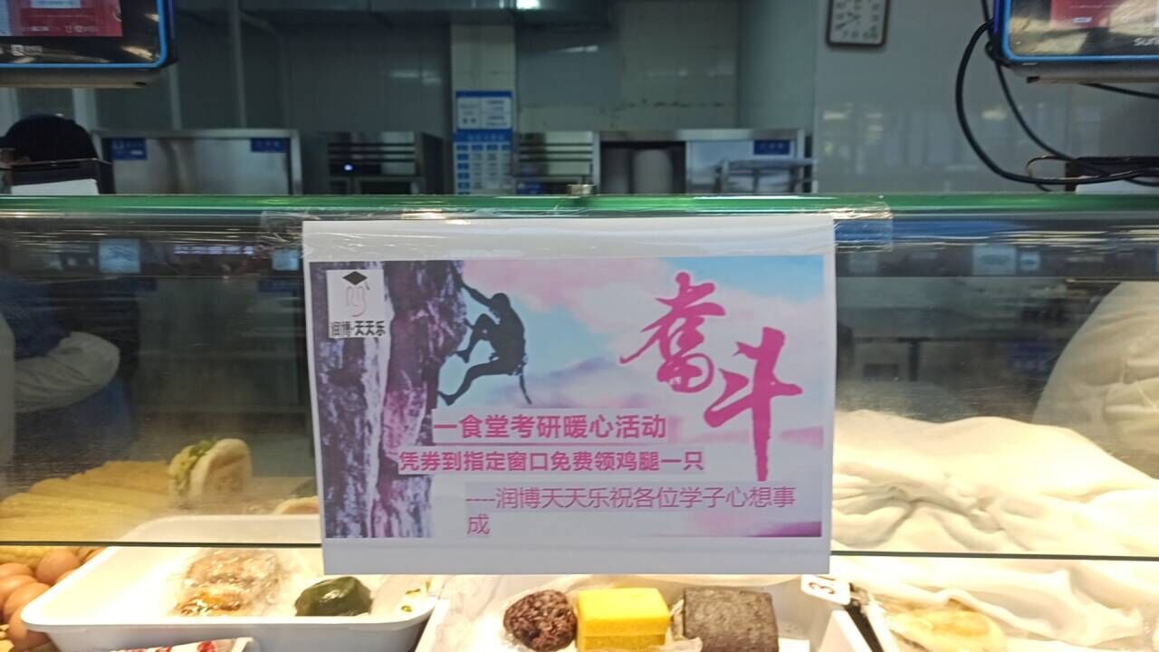 12月22日,学校共发放了1600余份“免费加餐券”。考研期间,学生可以凭“免费加餐券”在任意食堂指定地点领取“乘风破浪大鸡腿”和“心想事成小甜点”。